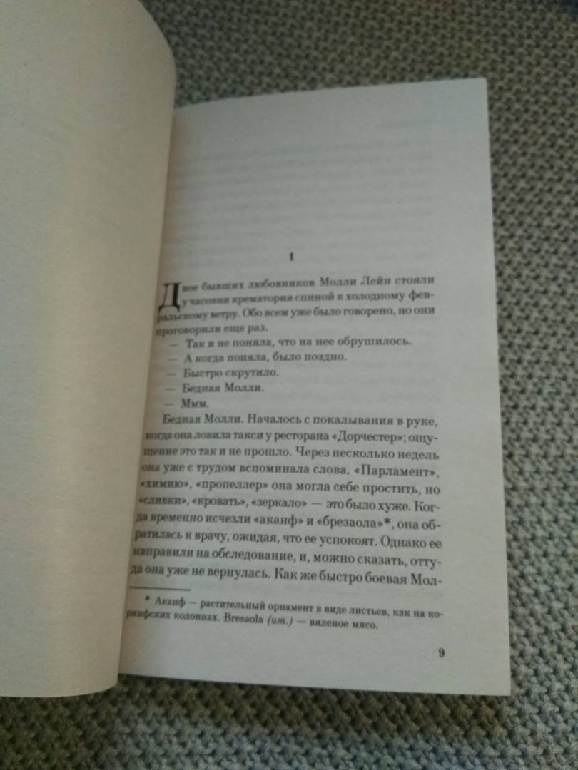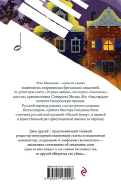 ОписаниеИэн Макьюэн — один из авторов "правящего триумвирата" современной британской прозы (наряду с Джулианом Барнсом и Мартином Эмисом). Его "Амстердам" получил Букеровскую премию. Русский перевод романа стал интеллектуальным бестселлером, а работа Виктора Голышева была отмечена российской премией "Малый Букер", в первый и единственный раз присужденной именно за перевод.Двое друзей — преуспевающий главный редактор популярной ежедневной газеты и знаменитый композитор, работающий над "Симфонией тысячелетия", — заключают соглашение об эвтаназии: если один из них впадет в состояние беспамятства и перестанет себя контролировать, то другой обязуется его убить...Иэн Макьюэн - один из самых знаменитых современных британских писателей. За дебютную книгу "Первая любовь, последнее помазание" получил премию имени