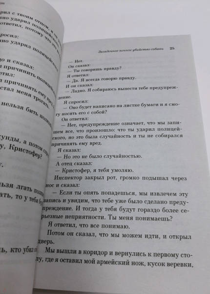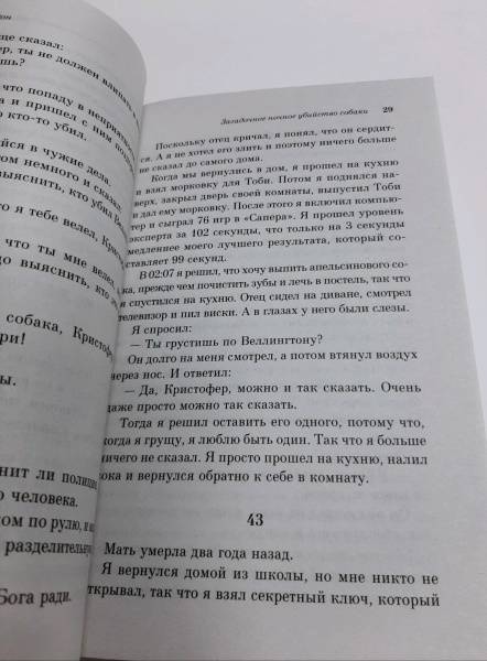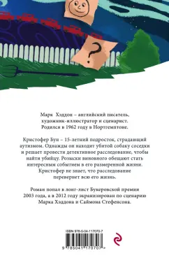 ОписаниеПятнадцатилетний Кристофер Бун - аутист. Он талантливый математик и очень умный парень, вот только его цепкая память и живой ум совсем не помогают ему в жизни. Пока однажды, если быть точными, в семь минут первого ночи, его не застают на заднем дворе соседей. Рядом лежит обезображенный пес. Теперь Кристофер подозреваемый! Сможет ли мальчик провести расследование и доказать окружающим, что он не имеет никакого отношения к смерти беззащитного животного. Или имеет?Пятнадцатилетний Кристофер Бун - аутист. Он талантливый математик и очень умный парень, вот только его цепкая память и живой ум совсем не помогают ему в жизни. Пока однажды, если быть точными, в семь минут первого ночи, его не застают на заднем дворе соседей. Рядом лежит обезображенный пес. Теперь Кристофер подозреваемый! Сможет ли мальчик провести расследование и доказать окружающим, что он не имеет никакого отношения к смерти беззащитного животного. Или имеет?