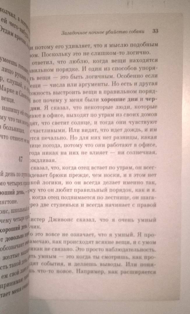 ОписаниеПятнадцатилетний Кристофер Бун - аутист. Он талантливый математик и очень умный парень, вот только его цепкая память и живой ум совсем не помогают ему в жизни. Пока однажды, если быть точными, в семь минут первого ночи, его не застают на заднем дворе соседей. Рядом лежит обезображенный пес. Теперь Кристофер подозреваемый! Сможет ли мальчик провести расследование и доказать окружающим, что он не имеет никакого отношения к смерти беззащитного животного. Или имеет?Кристофер не любит желтый и коричневый цвета, не может находиться в толпе и не терпит прикосновений. Он математический гений и, чтобы успокоиться, возводит 2 в