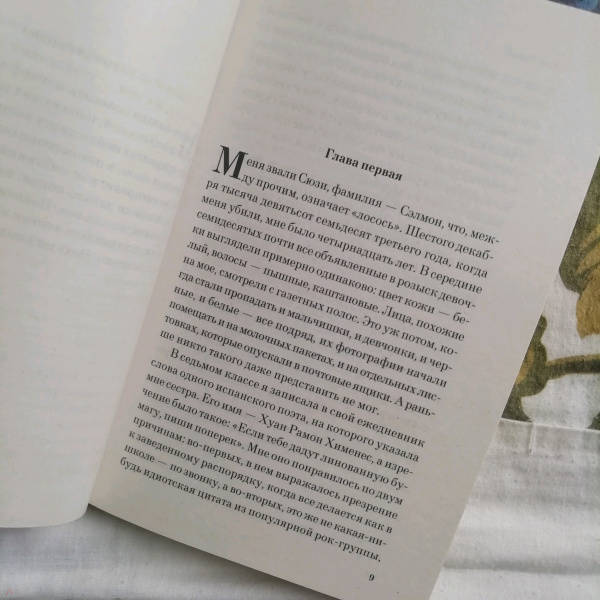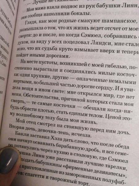 Описание"6 декабря 1973 года, когда меня убили, мне было четырнадцать лет" - так начинается эта трагическая история. Погибшая - главная героиня Сюзи Сэлмон - приспосабливается к жизни на небесах и наблюдает сверху за тем, как ее убийца пытается замести следы, а семья - свыкнуться с утратой... Эта сильная, драматическая книга не об убийстве, не о насилии, а о жизни. Жизни после смерти. Жизни тех, кто остался. Наверное, поэтому она написана таким удивительно светлым языком. "История, которая умнее даровитого автора могла бы обернуться слезливой мелодрамой, становится здесь тонким и проницательным рассказом о семейных отношениях и их изменчивости во времени" ("Minneapolis Star Tribune")."6 декабря 1973 года, когда меня убили, мне было четырнадцать лет" - так начинается эта трагическая история. Погибшая - главная героиня Сюзи Сэлмон - приспосабливается к жизни на небесах и наблюдает сверху за тем, как ее убийца пытается замести следы, а семья - свыкнуться с утратой... Эта сильная, драматическая книга не об убийстве, не о насилии, а о жизни. Жизни после смерти. Жизни тех, кто остался. Наверное, поэтому она написана таким удивительно светлым языком. "История, которая умнее даровитого автора могла бы обернуться слезливой мелодрамой, становится здесь тонким и проницательным рассказом о семейных отношениях и их изменчивости во времени" ("Minneapolis Star Tribune").