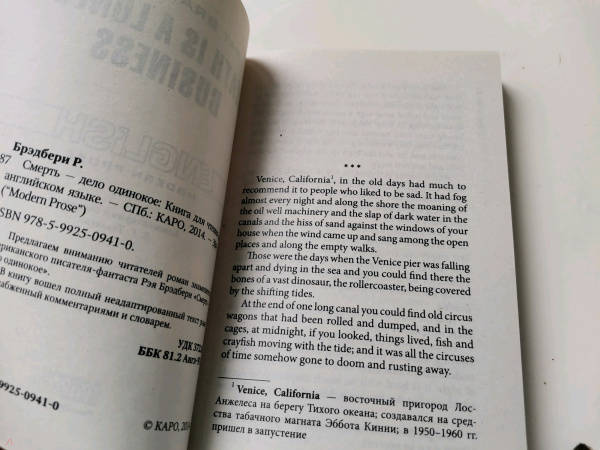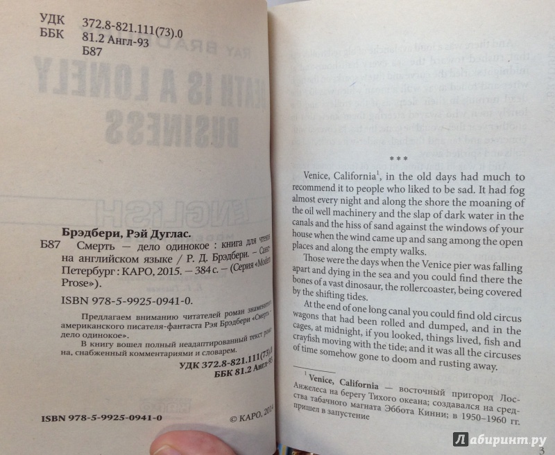 ОписаниеПредлагаем вниманию читателей роман знаменитого американского писателя-фантаста Рэя Брэдбери "Смерть - дело одинокое".В книгу вошел полный неадаптированный текст романа, снабженный комментариями и словарем.Комментарии и словарь Е. Г. Тигонен.Предлагаем вниманию читателей роман знаменитого американского писателя-фантаста Рэя Брэдбери "Смерть - дело одинокое".В книгу вошел полный неадаптированный текст романа, снабженный комментариями и словарем.Комментарии и словарь Е. Г. Тигонен.