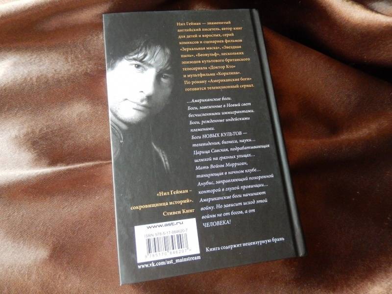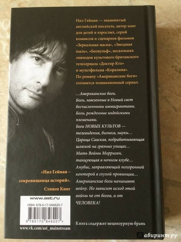 Описание"Американские боги" - одно из самых известных произведений Геймана. Это роман о богах, привезенных в Америку людьми из разных уголков мира, почитаемых, а потом забытых, и о том, к чему не может остаться равнодушным ни один мужчина: о поисках отца, родины, возлюбленной, о символической и реальной смерти."Американские боги" - одно из самых известных произведений Геймана. Это роман о богах, привезенных в Америку людьми из разных уголков мира, почитаемых, а потом забытых, и о том, к чему не может остаться равнодушным ни один мужчина: о поисках отца, родины, возлюбленной, о символической и реальной смерти.