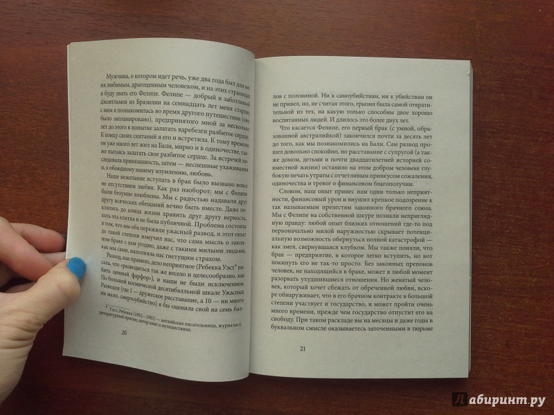 Описание"Есть, молиться, любить" заканчивается историей о том, как во время своего путешествия на Бали Элизабет Гилберт встретила разведенного бразильца Фелипе (Жозе Нуньеса). Целый год Фелипе и Гилберт поддерживали "междугородную связь". Девяносто дней бойфренд Гилберт провел рядом с ней в Америке, а всё остальное время они жили отдельно или путешествовали вместе по миру. Весной 2006 года пара вернулась в США. Прямо в аэропорту Далласа спутник Элизабет был задержан. Представитель таможни разъяснил Фелипе, что он может вновь въехать в страну только в том случае, если женится на своей американской подруге. Весь следующий год Элизабет Гилберт провела в изгнании вместе с Фелипе, она много читала о браке. Из размышлений Гилберт на эту тему и родилась эта книга."Есть, молиться, любить" заканчивается историей о том, как во время своего путешествия на Бали Элизабет Гилберт встретила разведенного бразильца Фелипе (Жозе Нуньеса). Целый год Фелипе и Гилберт поддерживали "междугородную связь". Девяносто дней бойфренд Гилберт провел рядом с ней в Америке, а всё остальное время они жили отдельно или путешествовали вместе по миру. Весной 2006 года пара вернулась в США. Прямо в аэропорту Далласа спутник Элизабет был задержан. Представитель таможни разъяснил Фелипе, что он может вновь въехать в страну только в том случае, если женится на своей американской подруге. Весь следующий год Элизабет Гилберт провела в изгнании вместе с Фелипе, она много читала о браке. Из размышлений Гилберт на эту тему и родилась эта книга.