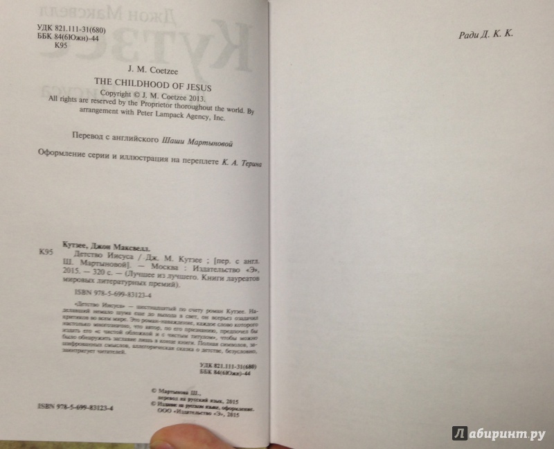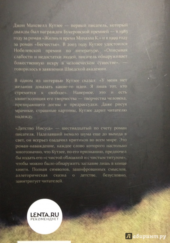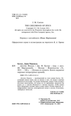 Описание"Детство Иисуса" - шестнадцатый по счету роман Кутзее. Наделавший немало шума еще до выхода в свет, он всерьез озадачил критиков во всем мире. Это роман-наваждение, каждое слово которого настолько многозначно, что автор, по его словам, предпочел бы издать его "с чистой обложкой и с чистым титулом", чтобы можно было обнаружить заглавие лишь в конце книги. Полная символов, зашифрованных смыслов, аллегорическая сказка о детстве, безусловно, заинтригует читателей."Детство Иисуса" - шестнадцатый по счету роман Кутзее. Наделавший немало шума еще до выхода в свет, он всерьез озадачил критиков во всем мире. Это роман-наваждение, каждое слово которого настолько многозначно, что автор, по его словам, предпочел бы издать его "с чистой обложкой и с чистым титулом", чтобы можно было обнаружить заглавие лишь в конце книги. Полная символов, зашифрованных смыслов, аллегорическая сказка о детстве, безусловно, заинтригует читателей.