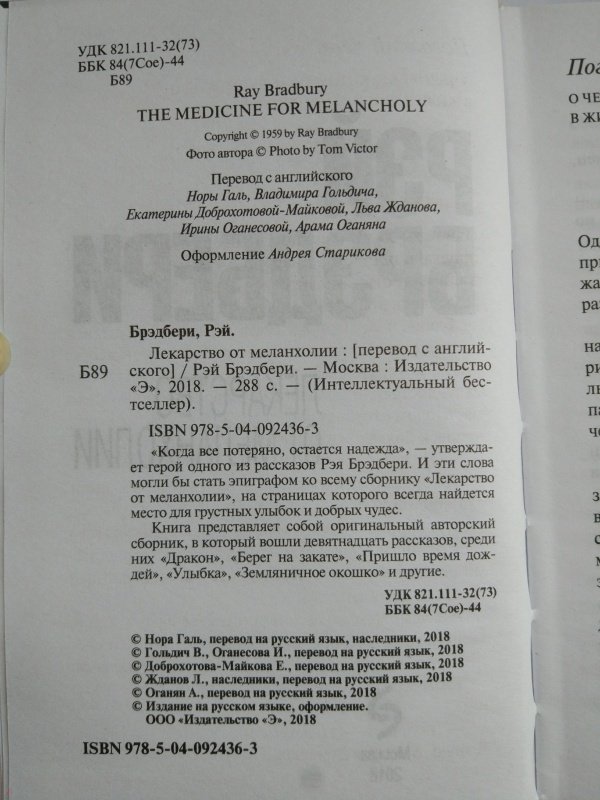 --Рэй Брэдбери: Лекарство от меланхолииРусская классическая и современная литератураЗарубежная художественная литератураРусская художественная литератураФэнтезиДраматургияПоэзияПриключенияФантастикаЭпос и фольклорКлассическая прозаАфоризмыИсторическая прозаДетективыБасниСентиментальная прозаОтечественный боевикСовременная прозаМолодежная литератураЗарубежная классическая и современная литература