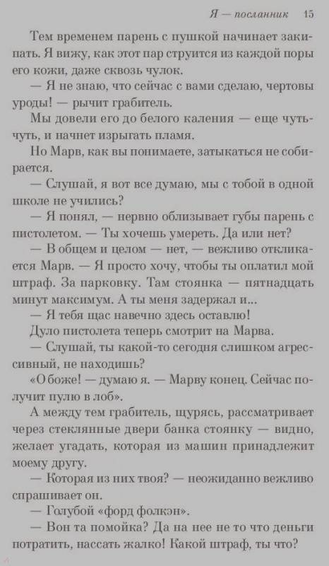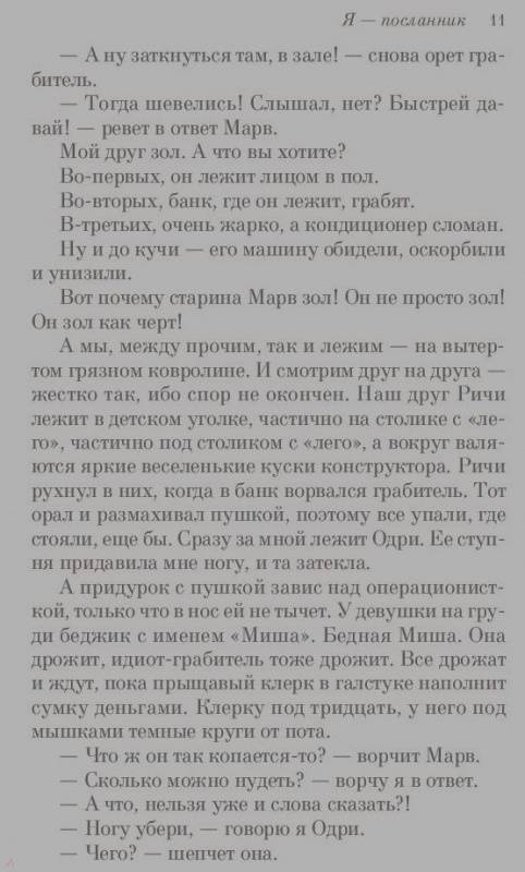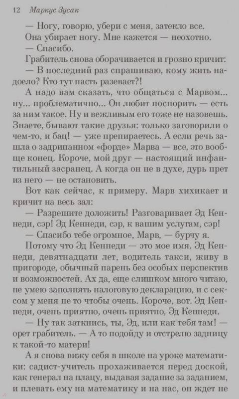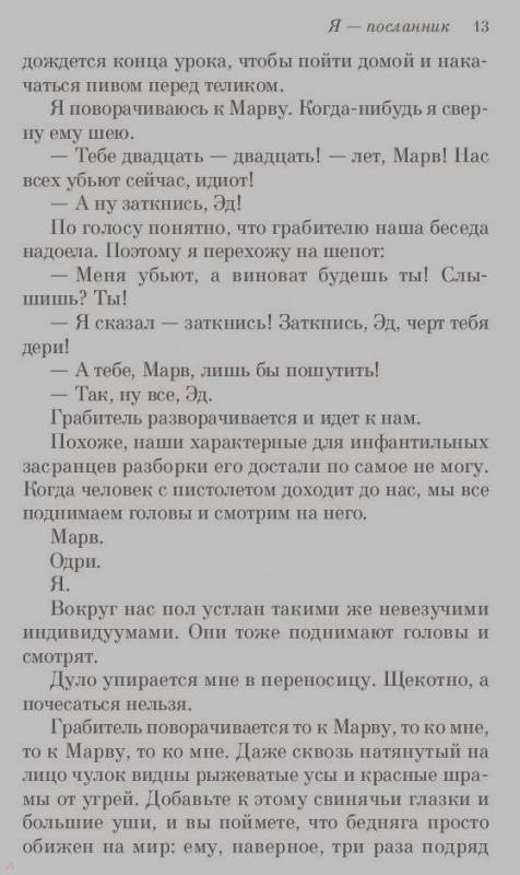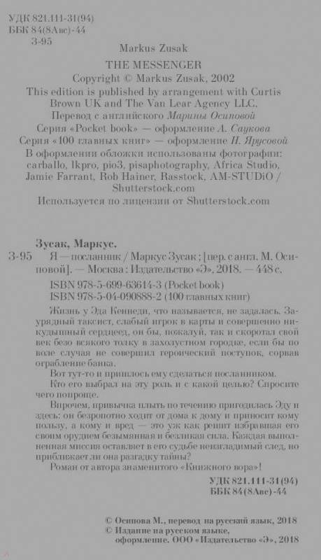 ОписаниеЖизнь у Эда Кеннеди, что называется, не задалась. Заурядный таксист, слабый игрок в карты и совершенно никудышный сердцеед, он бы, пожалуй, так и скоротал свой век безо всякого толку в захолустном городке, если бы по воле случая не совершил героический поступок, сорвав ограбление банка.Вот тут-то и пришлось ему сделаться посланником.Кто его выбрал на эту роль и с какой целью? Спросите чего попроще.Впрочем, привычка плыть по течению пригодилась Эду и здесь: он безропотно ходит от дома к дому и приносит кому пользу, а кому и вред - это уж как решит избравшая его своим орудием безымянная и безликая сила. Каждая выполненная миссия оставляет в его судьбе неизгладимый след, но приближает ли она разгадку тайны?Роман от автора знаменитого "Книжного вора"!Жизнь у Эда Кеннеди, что называется, не задалась. Заурядный таксист, слабый игрок в карты и совершенно никудышный сердцеед, он бы, пожалуй, так и скоротал свой век безо всякого толку в захолустном городке, если бы по воле случая не совершил героический поступок, сорвав ограбление банка.Вот тут-то и пришлось ему сделаться посланником.Кто его выбрал на эту роль и с какой целью? Спросите чего попроще.Впрочем, привычка плыть по течению пригодилась Эду и здесь: он безропотно ходит от дома к дому и приносит кому пользу, а кому и вред - это уж как решит избравшая его своим орудием безымянная и безликая сила. Каждая выполненная миссия оставляет в его судьбе неизгладимый след, но приближает ли она разгадку тайны?Роман от автора знаменитого "Книжного вора"!