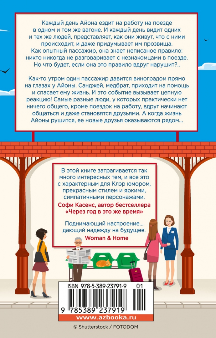 ОписаниеКаждый день Айона ездит на работу на поезде в одном и том же вагоне. И каждый день она видит одних и тех же людей, мысленно представляет, как они живут, какие события происходят в их жизни, и даже придумывает им прозвища. Как опытный пассажир, она знает неписаное правило: никто никогда не разговаривает с незнакомцами в поезде. Но что было бы, если бы она это сделала? В какие приключения могли бы вовлечь ее подобные разговоры? Однажды утром один пассажир подавился виноградом прямо на глазах у Айоны. Санджей, медбрат, приходит на помощь и спасает ему жизнь. И это событие вызывает цепную реакцию. Самые разные люди, у которых практически нет ничего общего, кроме поездок на работу, начинают общаться и даже становятся друзьями. А когда жизнь Айоны рушится, ее новые друзья оказываются рядом. "Люди с платформы № 5" - замечательный роман, наполненный радостью, мудростью, теплом и любовью.Каждый день Айона ездит на работу на поезде в одном и том же вагоне. И каждый день она видит одних и тех же людей, мысленно представляет, как они живут, какие события происходят в их жизни, и даже придумывает им прозвища. Как опытный пассажир, она знает неписаное правило: никто никогда не разговаривает с незнакомцами в поезде. Но что было бы, если бы она это сделала? В какие приключения могли бы вовлечь ее подобные разговоры? Однажды утром один пассажир подавился виноградом прямо на глазах у Айоны. Санджей, медбрат, приходит на помощь и спасает ему жизнь. И это событие вызывает цепную реакцию. Самые разные люди, у которых практически нет ничего общего, кроме поездок на работу, начинают общаться и даже становятся друзьями. А когда жизнь Айоны рушится, ее новые друзья оказываются рядом. "Люди с платформы № 5" - замечательный роман, наполненный радостью, мудростью, теплом и любовью.