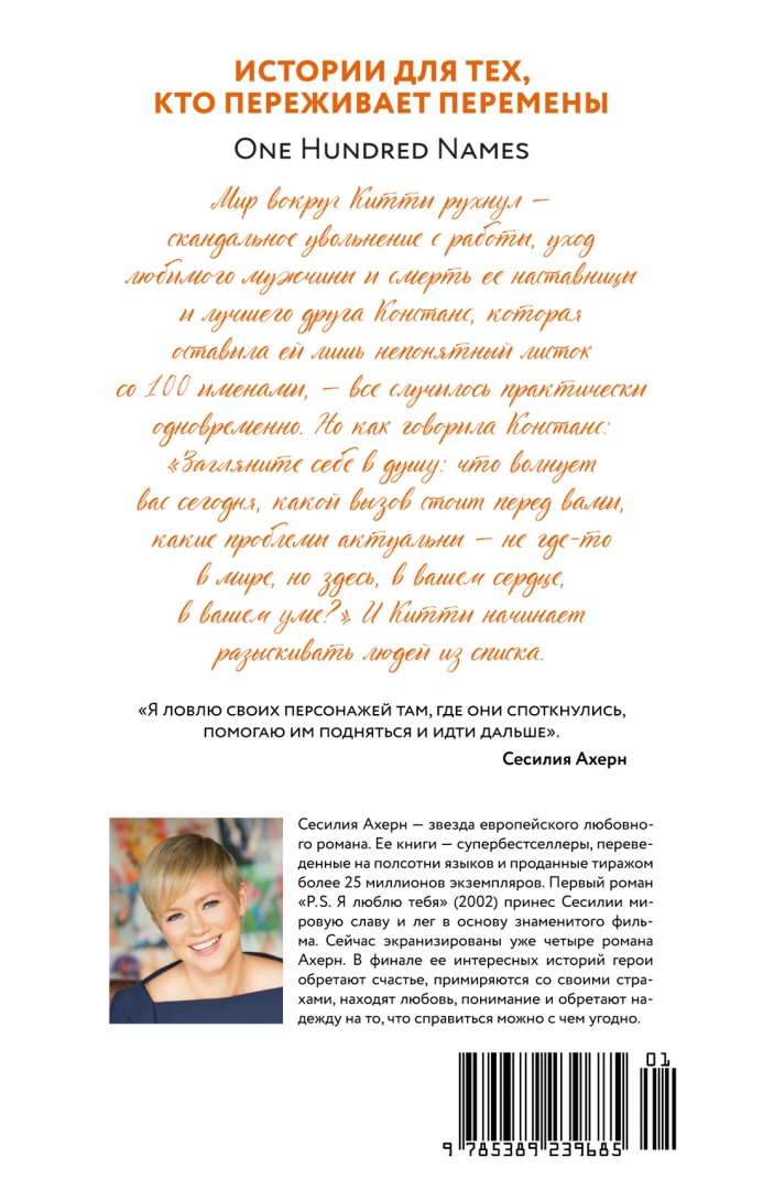 «Каждый, каждый человек на свете может рассказать свою собственную историю. У каждого, самого обычного человека — необычная история. Люди думают, будто они ничем не замечательны, будто их жизнь обыденна и скучна, раз о них не пишут в передовицах, они не получают международных премий и не совершают подвигов, но на самом деле каждый совершает что-то хорошее, удивительное, какой-то отважный поступок, что-то, чем может гордиться. Каждый день — и никто этого не замечает. Вот о чем надо писать. О невоспетых героях, о людях, которые себя и героями-то вовсе не считают, просто делают то, что надо делать. У каждого есть своя история». (Сесилия Ахерн)СвернутьЧереда проблем преследует талантливую журналистку Китти — непроверенная информация становится причиной грандиозного скандала и приводит к ее увольнению с телевидения, от Китти уходит молодой человек, умирает ее лучший друг и наставница, оставившая ей список из 100 имен. Китти начинает расследование, встречаясь с каждым из этих 100 человек и узнавая его историю.
