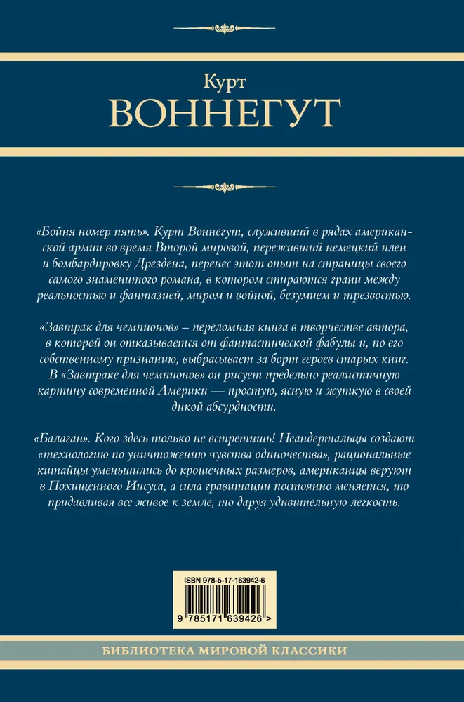 -Воннегут Курт: Бойня номер пять. Завтрак для чемпионов. БалаганРусская классическая и современная литератураДетектив. Остросюжетная литератураЗарубежная художественная литератураРусская художественная литератураФэнтезиДраматургияПоэзияПриключенияФантастикаЭпос и фольклорКлассическая прозаАфоризмыИсторическая прозаДетективыБасниСентиментальная прозаОтечественный боевикСовременная прозаМолодежная литература