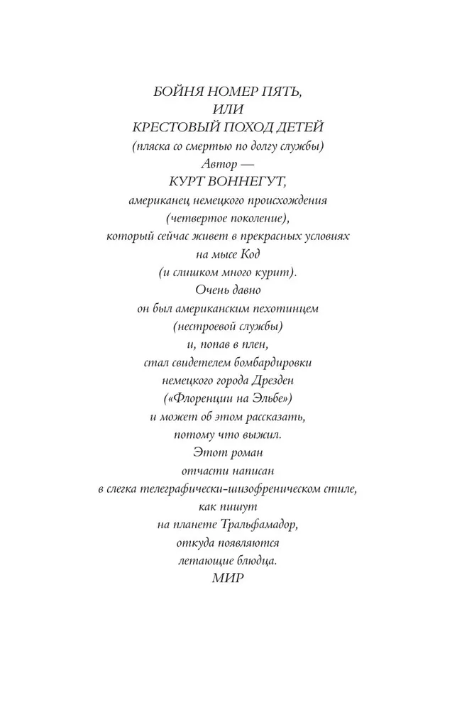 ОписаниеАннотация к книге "Бойня номер пять. Завтрак для чемпионов. Балаган" Воннегут К.:Американский писатель, сатирик, журналист и художник, автор знаменитых на весь мир романов "Колыбель для кошки" и "Бойня номер пять". В произведениях Курта Воннегута отразился практически весь сумасшедший ХХ век: Вторая мировая война, сексуальная и научная революции, фантастические идеи и просто жизнь обыкновенных людей.В сборник включены романы "Бойня номер пять", "Завтрак для чемпионов" и "Балаган". Читать дальше…