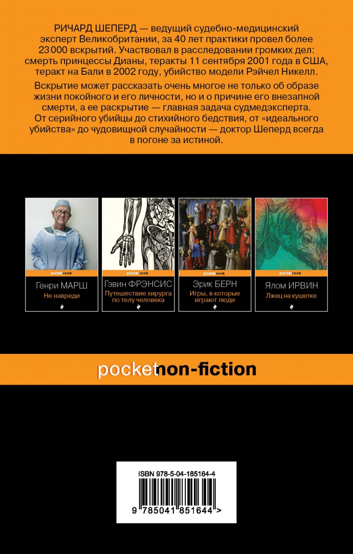 ОписаниеОдна из лучших книг в Великобритании за 2018 год (по версии The Times). Автор – ведущий судмедэксперт Великобритании, один из самых известных специалистов в своей области. Опыт его работы более 40 лет, за это время провел около 23 000 вскрытий, в том числе принимал участие в расследовании терактов 11 сентября 2001 года в США и смерти принцессы Дианы. В России уже продано более 120 000 экземпляров.Одна из лучших книг в Великобритании за 2018 год (по версии The Times). Автор – ведущий судмедэксперт Великобритании, один из самых известных специалистов в своей области. Опыт его работы более 40 лет, за это время провел около 23 000 вскрытий, в том числе принимал участие в расследовании терактов 11 сентября 2001 года в США и смерти принцессы Дианы. В России уже продано более 120 000 экземпляров.