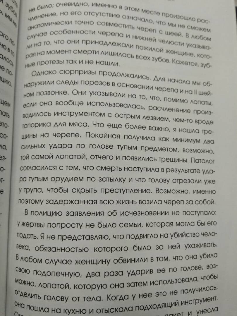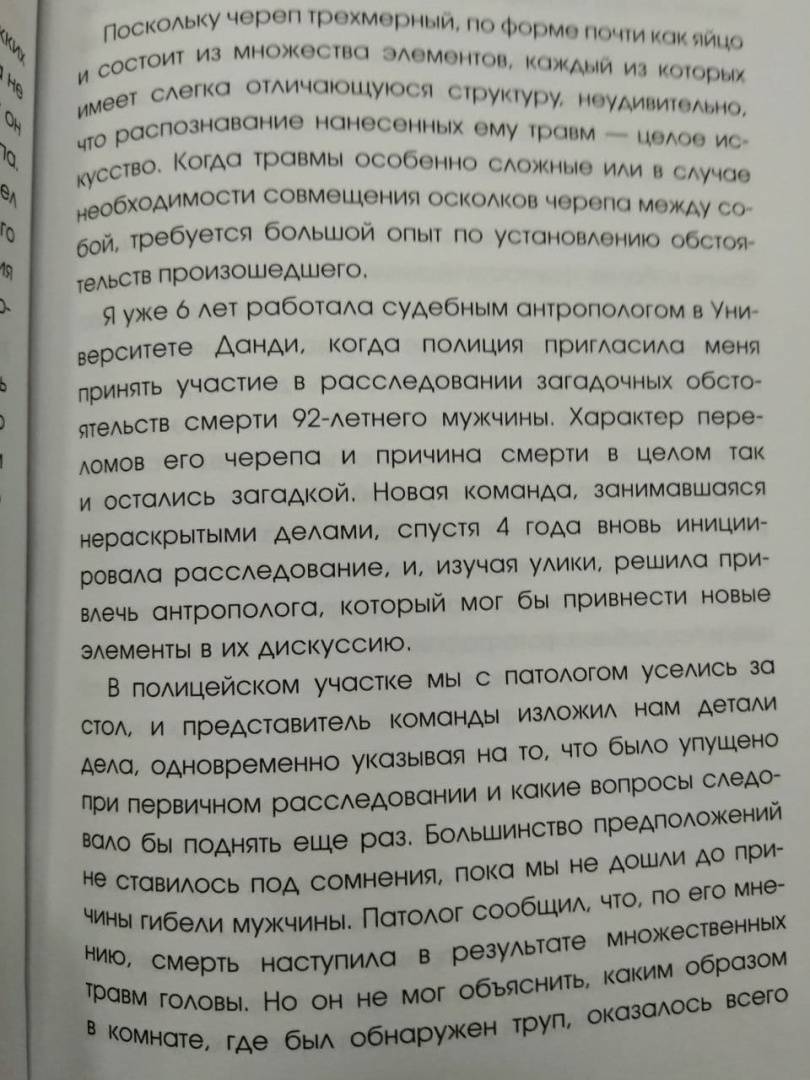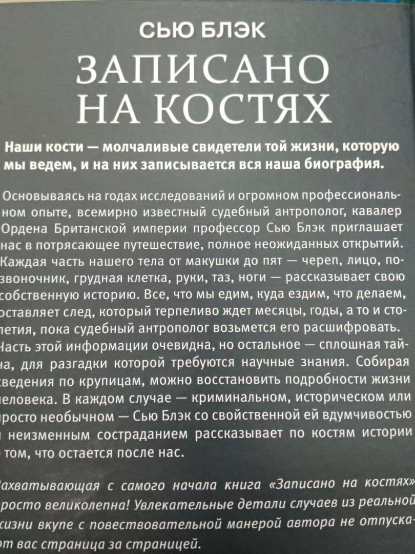 ОписаниеНовая книга автора бестселлера The Sunday Times "Все, что осталось"!Наши кости - молчаливые свидетели той жизни, которую мы ведем, и на них записывается вся наша биография.Основываясь на годах исследований и огромном профессиональном опыте, всемирно известный судебный антрополог, кавалер Ордена Британской империи профессор Сью Блэк приглашает нас в потрясающее путешествие, полное неожиданных открытий. Каждая часть нашего тела от макушки до пят - череп, лицо, позвоночник, грудная клетка, руки, таз, ноги - рассказывает свою собственную историю. Все, что мы едим, куда ездим, что делаем, оставляет след, который терпеливо ждет месяцы, годы, а то и столетия, пока судебный антрополог возьмется его расшифровать. Часть этой информации очевидна, но остальное - сплошная тайна, для разгадки которой требуются научные знания. Собирая сведения по крупицам, можно восстановить подробности жизни человека. В каждом случае - криминальном, историческом или просто необычном - Сью Блэк со свойственной ей вдумчивостью и неизменным состраданием рассказывает по костям истории о том, что остается после нас."Захватывающая с самого начала книга "Записано на костях" просто великолепна! Увлекательные детали случаев из реальной жизни вкупе с повествовательной манерой автора не отпускают вас страница за страницей".Ричард Шеперд, автор главной книги 2018 года по версии The Times "Неестественные причины"СвернутьНовая книга автора бестселлера The Sunday Times "Все, что осталось"!Наши кости - молчаливые свидетели той жизни, которую мы ведем, и на них записывается вся наша биография.Основываясь на годах исследований и огромном профессиональном опыте, всемирно известный судебный антрополог, кавалер Ордена Британской империи профессор Сью Блэк приглашает нас в потрясающее путешествие, полное неожиданных открытий. Каждая часть нашего тела от макушки до пят - череп, лицо, позвоночник, грудная клетка, руки, таз, ноги - рассказывает свою собственную историю. Все, что мы едим, куда ездим, что делаем, оставляет след, который терпеливо ждет месяцы, годы, а то и столетия, пока судебный антрополог возьмется его расшифровать. Часть этой информации очевидна, но остальное - сплошная тайна, для разгадки которой требуются научные знания. Собирая сведения по крупицам, можно восстановить подробности жизни человека. В каждом случае - криминальном, историческом или просто необычном - Сью Блэк со свойственной ей вдумчивостью и неизменным состраданием рассказывает по костям истории о том, что остается после нас."Захватывающая с самого начала книга "Записано на костях" просто великолепна! Увлекательные детали случаев из реальной жизни вкупе с повествовательной манерой автора не отпускают вас страница за страницей".Ричард Шеперд, автор главной книги 2018 года по версии The Times "Неестественные причины"СвернутьСвернуть