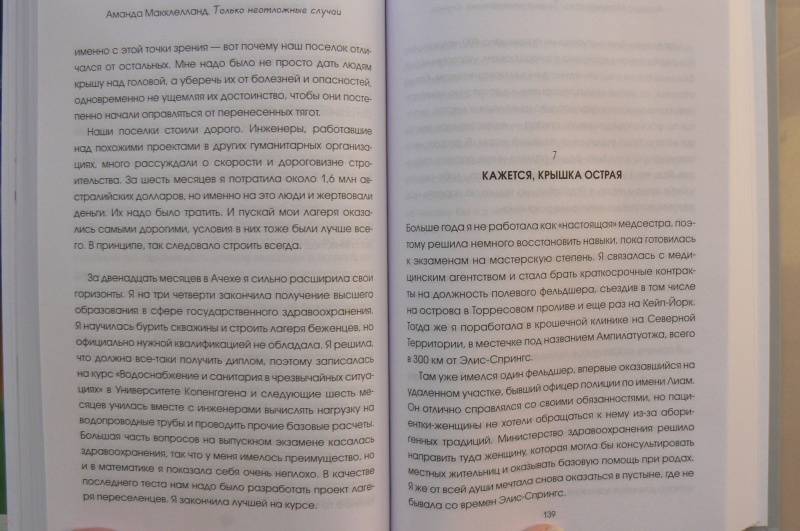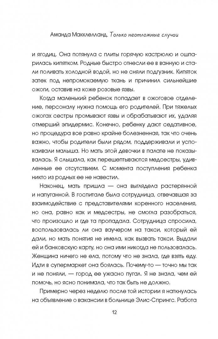 Описание"Только неотложные случаи" - история медсестры, участвовавшей в многочисленных миссиях Красного Креста.Свою карьеру Аманда Маклелланд начала в австралийской глуши, среди аборигенов, в роли фельдшера. Поняв, что такая работа по ней, Аманда поступает в Красный Крест и отправляется в свою первую миссию - в Южный Судан, где идёт война. Основной обязанностью ее становится обеспечение санитарных условий для гражданского населения. Далее следует Индонезия, потом Непал, где ей приходится пешком карабкаться по горам, чтобы добраться до отдаленных посёлков и наладить там систему водоснабжения. Потом Соломоновы острова, Уганда, Папуа Новая Гвинея, Конго, Эфиопия, Сомали...Наводнения, тропические ливни, жара и холод, отсутствие постоянного жилья и даже простейших удобств не останавливают сотрудников Красного Креста. И если из новостей мы слышим лишь краткие сообщения о действиях Красного Креста, то в книге узнаем, что стоит за ними на самом деле: месяцы упорного труда, борьба с погодными условиями, отрыв от семьи и друзей и даже опасность для жизни. Аманда откровенно пишет о том, как сама болела бруцеллезом и лихорадкой денге, малярией и тропической язвой. Как рисковала, контактируя с вирусом Эбола. Жизнь Аманды посвящена работе, и она готова и дальше идти по этому пути. Помогать людям.Свернуть"Только неотложные случаи" - история медсестры, участвовавшей в многочисленных миссиях Красного Креста.Свою карьеру Аманда Маклелланд начала в австралийской глуши, среди аборигенов, в роли фельдшера. Поняв, что такая работа по ней, Аманда поступает в Красный Крест и отправляется в свою первую миссию - в Южный Судан, где идёт война. Основной обязанностью ее становится обеспечение санитарных условий для гражданского населения. Далее следует Индонезия, потом Непал, где ей приходится пешком карабкаться по горам, чтобы добраться до отдаленных посёлков и наладить там систему водоснабжения. Потом Соломоновы острова, Уганда, Папуа Новая Гвинея, Конго, Эфиопия, Сомали...Наводнения, тропические ливни, жара и холод, отсутствие постоянного жилья и даже простейших удобств не останавливают сотрудников Красного Креста. И если из новостей мы слышим лишь краткие сообщения о действиях Красного Креста, то в книге узнаем, что стоит за ними на самом деле: месяцы упорного труда, борьба с погодными условиями, отрыв от семьи и друзей и даже опасность для жизни. Аманда откровенно пишет о том, как сама болела бруцеллезом и лихорадкой денге, малярией и тропической язвой. Как рисковала, контактируя с вирусом Эбола. Жизнь Аманды посвящена работе, и она готова и дальше идти по этому пути. Помогать людям.СвернутьСвернуть