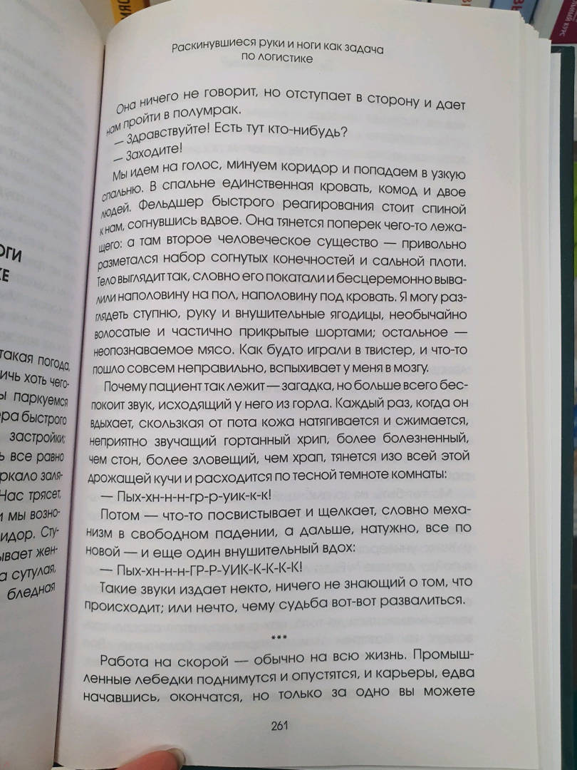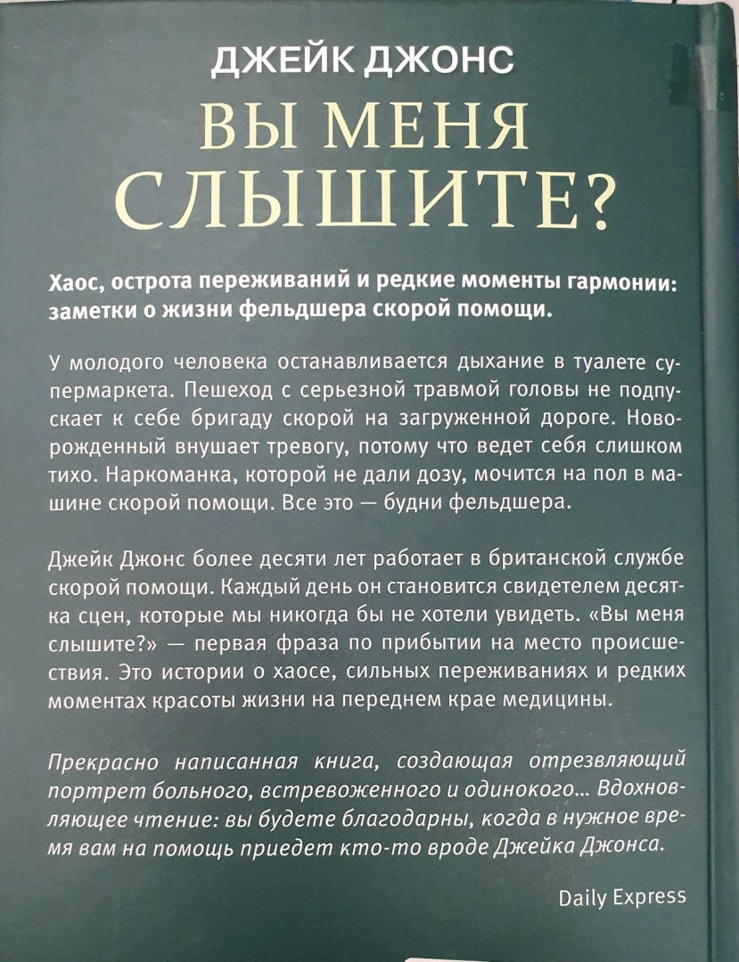 ОписаниеХаос, острота переживаний и редкие моменты гармонии: заметки о жизни фельдшера скорой помощи.У молодого человека останавливается дыхание в туалете супермаркета. Пешеход с серьезной травмой головы не подпускает к себе бригаду скорой на загруженной дороге. Новорожденный внушает тревогу, потому что ведет себя слишком тихо. Наркоманка, которой не дали дозу, мочится на пол в машине скорой помощи. Все это — будни фельдшера.Джейк Джонс более десяти лет работает в британской службе скорой помощи. Каждый день он становится свидетелем десятка сцен, которые мы никогда бы не хотели увидеть. "Вы меня слышите?" — первая фраза по прибытии на место происшествия. Это истории о хаосе, сильных переживаниях и редких моментах красоты жизни на переднем крае медицины."Прекрасно написанная книга, создающая отрезвляющий портрет больного, встревоженного и одинокого… Вдохновляющее чтение: вы будете благодарны, когда в нужное время вам на помощь приедет кто-то вроде Джейка Джонса".Daily ExpressСвернутьХаос, острота переживаний и редкие моменты гармонии: заметки о жизни фельдшера скорой помощи.У молодого человека останавливается дыхание в туалете супермаркета. Пешеход с серьезной травмой головы не подпускает к себе бригаду скорой на загруженной дороге. Новорожденный внушает тревогу, потому что ведет себя слишком тихо. Наркоманка, которой не дали дозу, мочится на пол в машине скорой помощи. Все это — будни фельдшера.Джейк Джонс более десяти лет работает в британской службе скорой помощи. Каждый день он становится свидетелем десятка сцен, которые мы никогда бы не хотели увидеть. "Вы меня слышите?" — первая фраза по прибытии на место происшествия. Это истории о хаосе, сильных переживаниях и редких моментах красоты жизни на переднем крае медицины."Прекрасно написанная книга, создающая отрезвляющий портрет больного, встревоженного и одинокого… Вдохновляющее чтение: вы будете благодарны, когда в нужное время вам на помощь приедет кто-то вроде Джейка Джонса".Daily ExpressСвернутьСвернуть