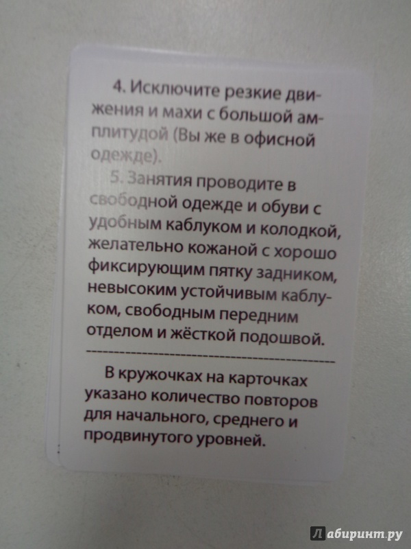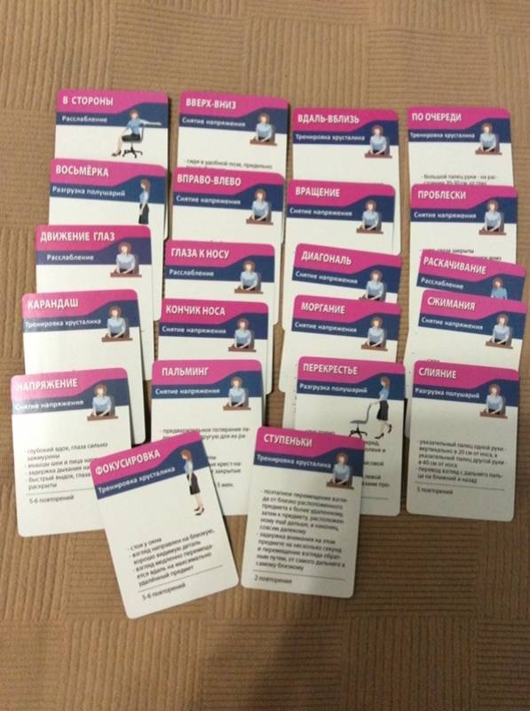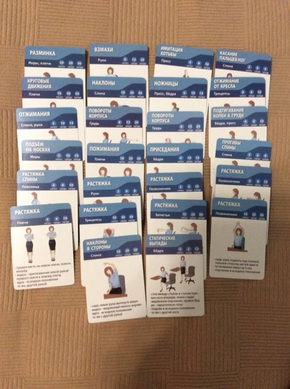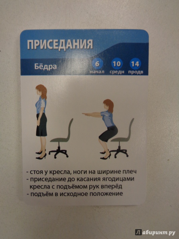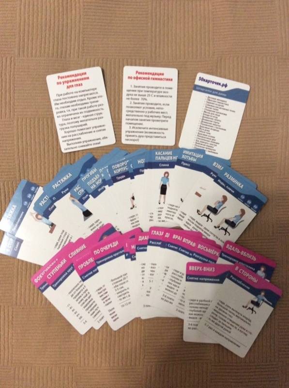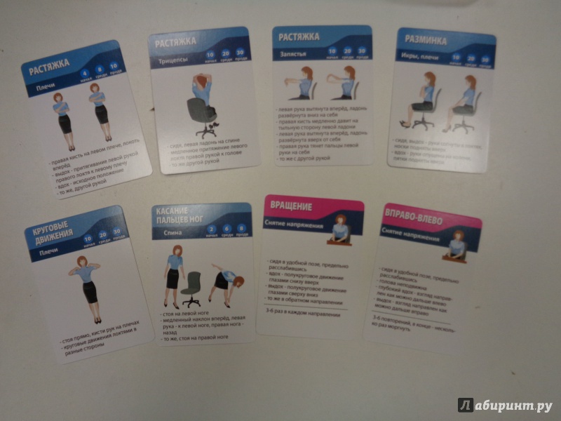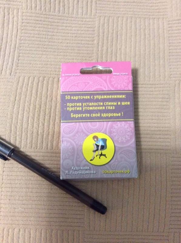 Описание50 маленьких карточек (90х65 мм) с офисной гимнастикой.Чтобы избежать ущерба для здоровья от работы в офисе, Вы должны периодически заботиться о восстановлении уставшего организма. Упражнения для тела и глаз на рабочем месте прекрасно подходят для этой цели.Однако, брошюры или сайты с примерами упражнений неудобны для использования во время занятий. Другое дело - карточки!Покупая Офисную гимнастику, Вы получаете 50 карточек:- 26 упражнений против усталости и напряжения спины, шеи, рук и ног- 22 упражнения против утомления глаз- для любого уровня подготовленности- для регулярных занятий- для поднятия настроения и тонуса.График занятий: по 5 минут 3-5 раз в день.Берегите здоровье на рабочем месте!50 маленьких карточек (90х65 мм) с офисной гимнастикой.Чтобы избежать ущерба для здоровья от работы в офисе, Вы должны периодически заботиться о восстановлении уставшего организма. Упражнения для тела и глаз на рабочем месте прекрасно подходят для этой цели.Однако, брошюры или сайты с примерами упражнений неудобны для использования во время занятий. Другое дело - карточки!Покупая Офисную гимнастику, Вы получаете 50 карточек:- 26 упражнений против усталости и напряжения спины, шеи, рук и ног- 22 упражнения против утомления глаз- для любого уровня подготовленности- для регулярных занятий- для поднятия настроения и тонуса.График занятий: по 5 минут 3-5 раз в день.Берегите здоровье на рабочем месте!