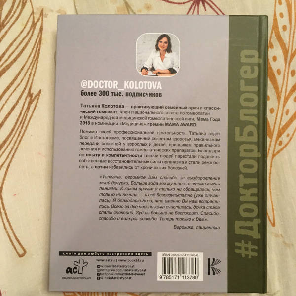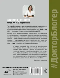 ОписаниеТатьяна Колотова - практикующий семейный врач и классический гомеопат, член Национального совета по гомеопатии и Международной медицинской гомеопатической лиги, Мама Года 2018 в номинации "Медицина" премии MAMA AWARD.Помимо своей профессиональной деятельности, Татьяна ведет блог в Инстаграме, посвященный секретам здоровья, механизмам передачи болезней у взрослых и детей, принципам правильного лечения и использованию гомеопатических препаратов. Благодаря ее опыту и компетентности тысячи людей перестали подавлять собственные восстановительные силы организма и стали реже болеть, а сотни избавились от хронических болезней.Татьяна Колотова - практикующий семейный врач и классический гомеопат, член Национального совета по гомеопатии и Международной медицинской гомеопатической лиги, Мама Года 2018 в номинации "Медицина" премии MAMA AWARD.Помимо своей профессиональной деятельности, Татьяна ведет блог в Инстаграме, посвященный секретам здоровья, механизмам передачи болезней у взрослых и детей, принципам правильного лечения и использованию гомеопатических препаратов. Благодаря ее опыту и компетентности тысячи людей перестали подавлять собственные восстановительные силы организма и стали реже болеть, а сотни избавились от хронических болезней.