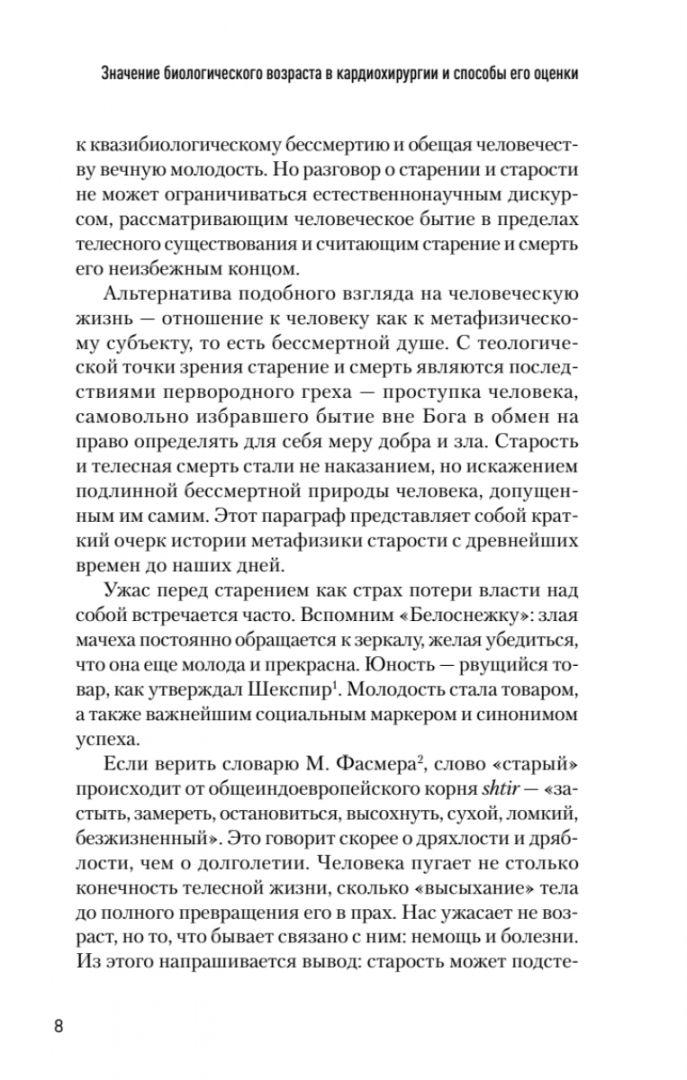 ОписаниеКнига подготовлена коллективом авторов — практикующими врачами Военно-медицинской академии им. С. М. Кирова, Первой клиники хирургии усовершенствования врачей им. П. А. Куприянова и доктором философских наук. Назим Шихвердиев — кардиохирург, профессор, доктор медицинских наук, заслуженный врач РФ, лауреат Государственной премии РФ. Дмитрий Ушаков — кардиохирург, кандидат медицинских наук. Григорий Хубулава — доктор философских наук.Настоящее издание — первое в России, посвященное значению биологического возраста в кардиохирургии и способам его оценки. В книге приведены результаты последних отечественных и зарубежных исследований. Рассмотрено восприятие старости в разные эпохи как этического и эстетического феномена, представлены различные теории старения. В отдельных главах исследуются возрастные особенности морфологии и физиологии органов и систем и факторы, влияющие на темпы старения, а также приводится оценка допустимости оперативного вмешательства и использования индексов изношенности организма. Для практикующих врачей — кардиологов, терапевтов, анестезиологов, ординаторов и студентов старших курсов медицинских вузов.СвернутьКнига подготовлена коллективом авторов — практикующими врачами Военно-медицинской академии им. С. М. Кирова, Первой клиники хирургии усовершенствования врачей им. П. А. Куприянова и доктором философских наук. Назим Шихвердиев — кардиохирург, профессор, доктор медицинских наук, заслуженный врач РФ, лауреат Государственной премии РФ. Дмитрий Ушаков — кардиохирург, кандидат медицинских наук. Григорий Хубулава — доктор философских наук.Настоящее издание — первое в России, посвященное значению биологического возраста в кардиохирургии и способам его оценки. В книге приведены результаты последних отечественных и зарубежных исследований. Рассмотрено восприятие старости в разные эпохи как этического и эстетического феномена, представлены различные теории старения. В отдельных главах исследуются возрастные особенности морфологии и физиологии органов и систем и факторы, влияющие на темпы старения, а также приводится оценка допустимости оперативного вмешательства и использования индексов изношенности организма. Для практикующих врачей — кардиологов, терапевтов, анестезиологов, ординаторов и студентов старших курсов медицинских вузов.СвернутьСвернуть