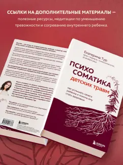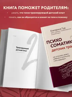 ОписаниеЕкатерина Тур - врач, психосоматолог и специалист по телесно-ориентированной терапии. В этой книге она рассказывает, как детский травмирующий опыт влияет на мозг и тело, как появляются психосоматические нарушения и к каким ментальным и физическим проблемам у ребенка это приводит. Чем опасны крик, наказания и отстраненное поведение? Какие заболевания связаны с психосоматикой? Как быть целостным и осознанным родителем и почему это так важно? Автор включила в книгу упражнения и практики, которые помогут проработать собственный болезненный опыт и страхи. "Детская психосоматика" - книга о безусловной любви, понимании и доверии и о том, как создать для своего ребенка по-настоящему счастливое детство. Книга основана на современных исследованиях в области эпигенетики, нейрофизиологии детей и взрослых, научной психосоматики.Екатерина Тур - врач, психосоматолог и специалист по телесно-ориентированной терапии. В этой книге она рассказывает, как детский травмирующий опыт влияет на мозг и тело, как появляются психосоматические нарушения и к каким ментальным и физическим проблемам у ребенка это приводит. Чем опасны крик, наказания и отстраненное поведение? Какие заболевания связаны с психосоматикой? Как быть целостным и осознанным родителем и почему это так важно? Автор включила в книгу упражнения и практики, которые помогут проработать собственный болезненный опыт и страхи. "Детская психосоматика" - книга о безусловной любви, понимании и доверии и о том, как создать для своего ребенка по-настоящему счастливое детство. Книга основана на современных исследованиях в области эпигенетики, нейрофизиологии детей и взрослых, научной психосоматики.