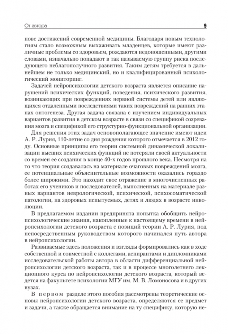 ОписаниеВ учебном пособии рассматриваются теоретические и эмпирические основы нейропсихологии детского возраста. Описываются предмет и задачи клинической и дифференциальной нейропсихологии детского возраста. Представлен нейропсихологический анализ нарушений психических функций, психического развития, поведения, причиной которых являются органические повреждения мозга, а также минимальные мозговые дисфункции, рассматриваемые как следствие резидуальных проявлений нарушений нервной системы в раннем онтогенезе. Отдельный раздел посвящен нейропсихологии индивидуальных различий детского возраста. Дано описание методов нейропсихологической диагностики и коррекции.Пособие адресовано студентам психологических факультетов вузов, нейропсихологам, представителям других психологических, а также медицинских специальностей.В учебном пособии рассматриваются теоретические и эмпирические основы нейропсихологии детского возраста. Описываются предмет и задачи клинической и дифференциальной нейропсихологии детского возраста. Представлен нейропсихологический анализ нарушений психических функций, психического развития, поведения, причиной которых являются органические повреждения мозга, а также минимальные мозговые дисфункции, рассматриваемые как следствие резидуальных проявлений нарушений нервной системы в раннем онтогенезе. Отдельный раздел посвящен нейропсихологии индивидуальных различий детского возраста. Дано описание методов нейропсихологической диагностики и коррекции.Пособие адресовано студентам психологических факультетов вузов, нейропсихологам, представителям других психологических, а также медицинских специальностей.