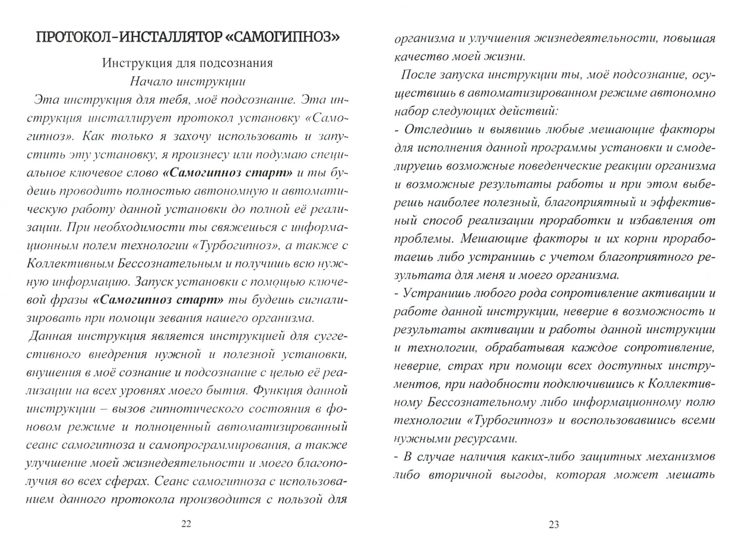 ОписаниеВ этом сборнике вы найдете серию готовых гипнотических программ для подсознания на основе системы "Турбогипноз". Автоматизированная система программирования подсознания "ТурбоГипноз" - это инструмент, с помощью которого вы можете реализовать свои намерения от улучшения поведения и личностных характеристик до реализации глобальных материальных и духовных желаний. Система позволяет быстро встраивать в себя желаемые программы и установки с помощью текстовых готовых моделей и алгоритмов. В этом сборнике вы получите группу готовых гипнопротоколов, где каждый из них является мощной гипнотической программой для реализации определенного намерения, включая такие намерения, как увеличение вашей энергии и силы, настрой на успех в любом деле, обретение уверенности в любви и отношениях, обретение состояния спокойствия, усиление способности качественно заниматься любовью и получать еще больше удовольствия от этого, решение проблемы со сном, настрой на увеличение финансовых доходов, повышение уверенности в работе и бизнесе, включение способности успешно выступать перед публикой, раскрытие творческого начала, улучшение речевых и коммуникативных навыков, а также программы на снятие и очищение от любого негатива, преодоление страхов и депрессии, бросить курить, избавиться от вредных привычек, избавиться от аллергии, улучшить память и сосредоточенность, а также программа, позволяющая взять под контроль боль и вызвать эффект обезболивания при соответствующем желании.Эти гипнотические программы призваны помочь вам в реализации ваших желаний. Пользуйтесь ими и системой "Турбогипноз" на благо себе и окружающего вас мира.СвернутьВ этом сборнике вы найдете серию готовых гипнотических программ для подсознания на основе системы "Турбогипноз". Автоматизированная система программирования подсознания "ТурбоГипноз" - это инструмент, с помощью которого вы можете реализовать свои намерения от улучшения поведения и личностных характеристик до реализации глобальных материальных и духовных желаний. Система позволяет быстро встраивать в себя желаемые программы и установки с помощью текстовых готовых моделей и алгоритмов. В этом сборнике вы получите группу готовых гипнопротоколов, где каждый из них является мощной гипнотической программой для реализации определенного намерения, включая такие намерения, как увеличение вашей энергии и силы, настрой на успех в любом деле, обретение уверенности в любви и отношениях, обретение состояния спокойствия, усиление способности качественно заниматься любовью и получать еще больше удовольствия от этого, решение проблемы со сном, настрой на увеличение финансовых доходов, повышение уверенности в работе и бизнесе, включение способности успешно выступать перед публикой, раскрытие творческого начала, улучшение речевых и коммуникативных навыков, а также программы на снятие и очищение от любого негатива, преодоление страхов и депрессии, бросить курить, избавиться от вредных привычек, избавиться от аллергии, улучшить память и сосредоточенность, а также программа, позволяющая взять под контроль боль и вызвать эффект обезболивания при соответствующем желании.Эти гипнотические программы призваны помочь вам в реализации ваших желаний. Пользуйтесь ими и системой "Турбогипноз" на благо се