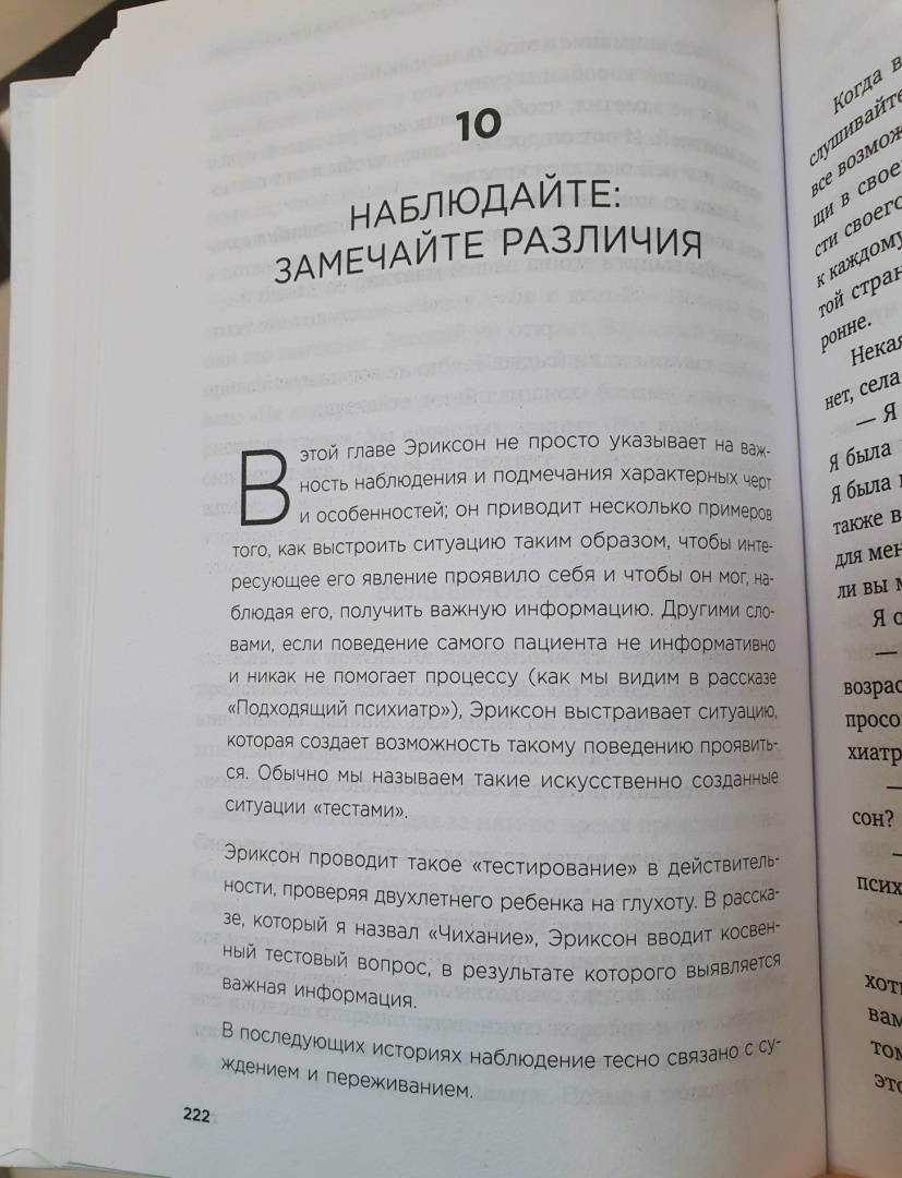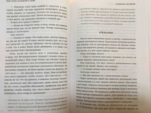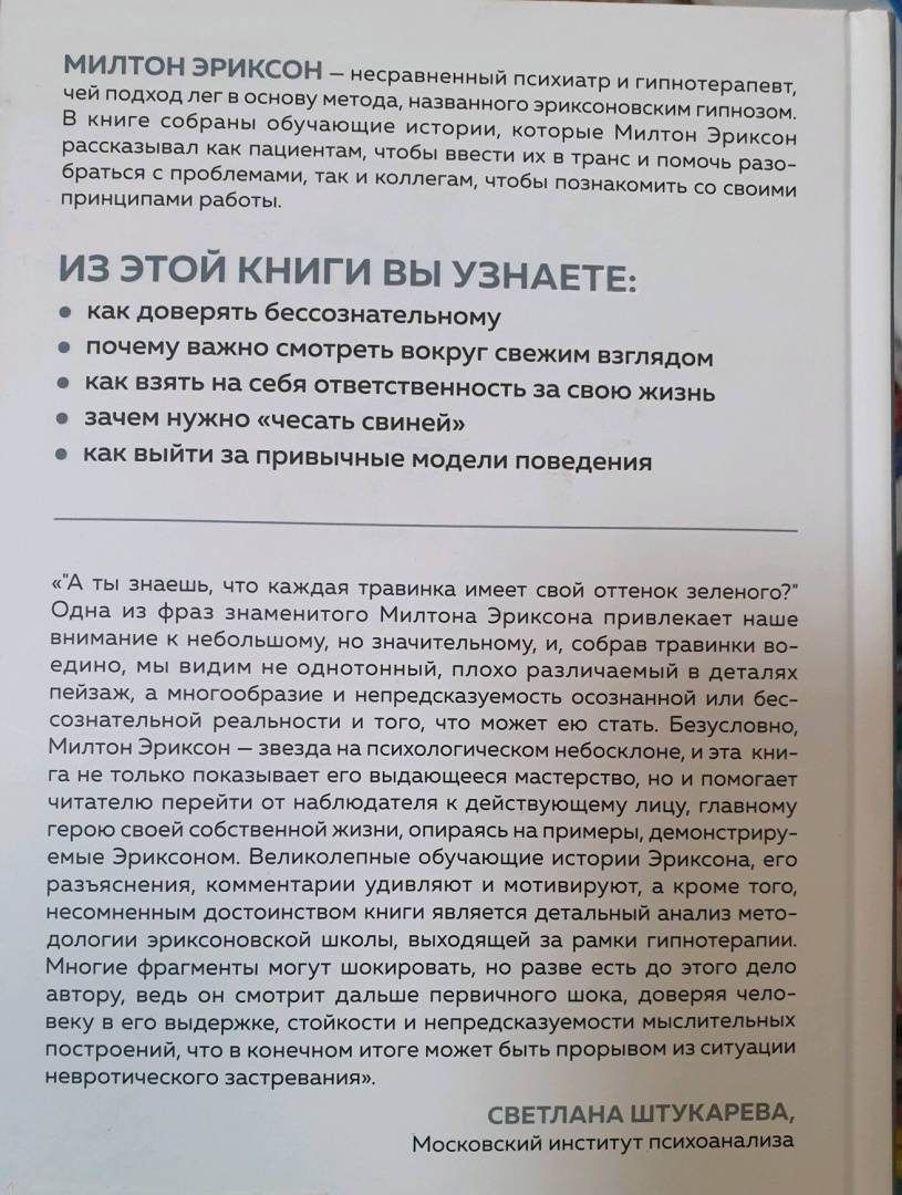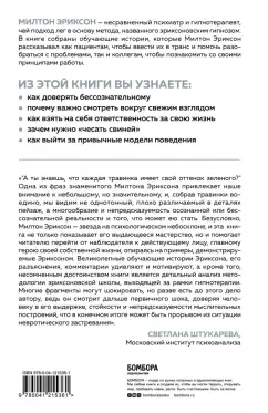 ОписаниеМилтон Эриксон - несравненный психиатр и гипнотерапевт, известный во всем мире, чей подход лег в основу метода, названого эриксоновским гипнозом. В книге собраны обучающие истории, которые Милтон Эриксон рассказывал как своим пациентам, чтобы ввести их в транс и помочь разобраться с их проблемами, так и своим коллегам, чтобы познакомить их со своими принципами работы. Из этой книги вы узнаете: - как доверять бессознательному; - как выйти за привычные модели поведения; - как взять на себя ответственность за свою жизнь; - почему важно смотреть вокруг свежим взглядом; - зачем нужно "чесать свиней".Милтон Эриксон - несравненный психиатр и гипнотерапевт, известный во всем мире, чей подход лег в основу метода, названого эриксоновским гипнозом. В книге собраны обучающие истории, которые Милтон Эриксон рассказывал как своим пациентам, чтобы ввести их в транс и помочь разобраться с их проблемами, так и своим коллегам, чтобы познакомить их со своими принципами работы. Из этой книги вы узнаете: - как доверять бессознательному; - как выйти за привычные модели поведения; - как взять на себя ответственность за свою жизнь; - почему важно смотреть вокруг свежим взглядом; - зачем нужно "чесать свиней".