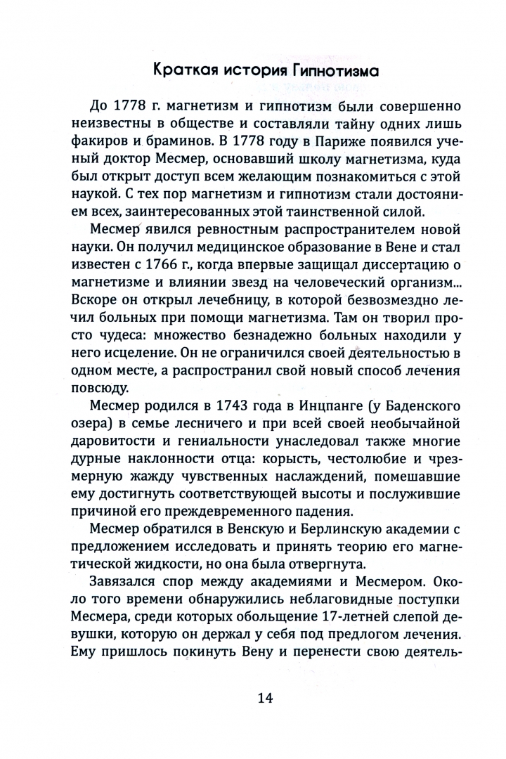 ОписаниеКнига "Новый курс гипнотизма" - популярный учебник по гипнозу, написанный известным психо-френологлом и гипнотизёром Х. М. Шиллером-Школьником и изданный в 1914 году. Автор пишет: "... я старался, насколько это доступно моим силам, просто, общепонятно и кратко ознакомить читателей, заинтересованных вопросом о гипнотизме, с духовной силой, заключающейся внутри нас. В этой силе, в умении пользоваться ею заключается наше благополучие, так называемое счастье. Лица, не умеющие распоряжаться своей волей, внутренней духовной силой, каково бы ни было их общественное и материальное положение, безусловно, несчастны. Счастливы сильные духом!"Для широкого круга читателей, интересующихся гипнозом и его возможностями.Книга "Новый курс гипнотизма" - популярный учебник по гипнозу, написанный известным психо-френологлом и гипнотизёром Х. М. Шиллером-Школьником и изданный в 1914 году. Автор пишет: "... я старался, насколько это доступно моим силам, просто, общепонятно и кратко ознакомить читателей, заинтересованных вопросом о гипнотизме, с духовной силой, заключающейся внутри нас. В этой силе, в умении пользоваться ею заключается наше благополучие, так называемое счастье. Лица, не умеющие распоряжаться своей волей, внутренней духовной силой, каково бы ни было их общественное и материальное положение, безусловно, несчастны. Счастливы сильные духом!"Для широкого круга читателей, интересующихся гипнозом и его возможностями.