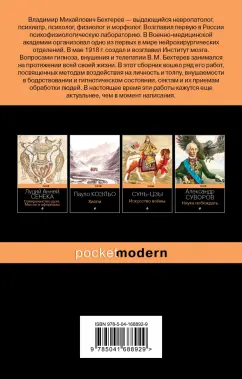 ОписаниеВладимир Михайлович Бехтерев - выдающийся невропатолог, психиатр, психолог, физиолог и морфолог. Окончил Медико-хирургическую академию в Петербурге; участник Русско-турецкой войны 1877-1878 гг. Возглавил первую в России психофизиологическую лабораторию. В Военно-медицинской академии организовал одно из первых в мире нейрохирургических отделений. В мае 1918 г. создал и возглавил Институт мозга. В сборник вошли работы, дающие исчерпывающие знания о гипнозе, объективных признаках гипнотического состояния. Примеры из практики В.М. Бехтерева, лечение навязчивых идей гипнозом. Статьи об убеждении и внушении, истории о сектантах и эпидемиях бесноватости и колдовства. О роли личности в истории и о том, что внушение - важнейшая сила, которая служит мощным орудием в руках счастливо одаренных натур. В настоящее время эти работы кажутся еще более актуальными, чем в момент написания.Владимир Михайлович Бехтерев - выдающийся невропатолог, психиатр, психолог, физиолог и морфолог. Окончил Медико-хирургическую академию в Петербурге; участник Русско-турецкой войны 1877-1878 гг. Возглавил первую в России психофизиологическую лабораторию. В Военно-медицинской академии организовал одно из первых в мире нейрохирургических отделений. В мае 1918 г. создал и возглавил Институт мозга. В сборник вошли работы, дающие исчерпывающие знания о гипнозе, объективных признаках гипнотического состояния. Примеры из практики В.М. Бехтерева, лечение навязчивых идей гипнозом. Статьи об убеждении и внушении, истории о сектантах и эпидемиях бесноватости и колдовства. О роли личности в истории и о том, что внушение - важнейшая сила, которая служит мощным орудием в руках счастливо одаренных натур. В настоящее время эти работы кажутся еще более актуальными, чем в момент написания.
