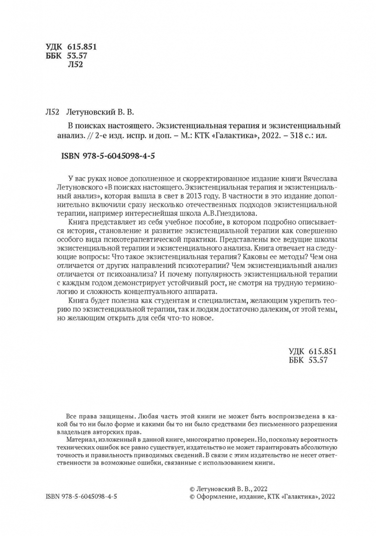 ОписаниеУ вас руках новое дополненное и скорректированное издание книги Вячеслава Летуновского "В поисках настоящего. Экзистенциальная терапия и экзи-стенциальный анализ", которая вышла в свет в 2013 году. В частности в это издание дополнительно включили сразу несколько отечественных подходов экзистенциальной терапии, например интереснейшая школа А.В.Гнездилова.Книга представляет из себя учебное пособие, в котором подробно описывается история, становление и развитие экзистенциальной терапии как совершенно особого вида психотерапевтической практики. Представлены все ведущие школы экзистенциальной терапии и экзистенциального анализа. Книга отвечает на следующие вопросы: Что такое экзистенциальная терапия? Каковы ее методы? Чем она отличается от других направлений психотерапии? Чем экзистенциальный анализ отличается от психоанализа? И почему популярность экзистенциальной терапии с каждым годом демонстрирует устойчивый рост, не смотря на трудную терминологию и сложность концептуального аппарата. Книга будет полезна как студентам и специалистам, желающим укрепить теорию по экзистенциальной терапии, так и людям достаточно далеким, от этой темы, но желающим открыть для себя что-то новое.2-е издание, исправленное и дополненное.СвернутьУ вас руках новое дополненное и скорректированное издание книги Вячеслава Летуновского "В поисках настоящего. Экзистенциальная терапия и экзи-стенциальный анализ", которая вышла в свет в 2013 году. В частности в это издание дополнительно включили сразу несколько отечественных подходов экзистенциальной терапии, например интереснейшая школа А.В.Гнездилова.Книга представляет из себя учебное пособие, в котором подробно описывается история, становление и развитие экзистенциальной терапии как совершенно особого вида психотерапевтической практики. Представлены все ведущие школы экзистенциальной терапии и экзистенциального анализа. Книга отвечает на следующие вопросы: Что такое экзистенциальная терапия? Каковы ее методы? Чем она отличается от других направлений психотерапии? Чем экзистенциальный анализ отличается от психоанализа? И почему популярность экзистенциальной терапии с каждым годом демонстрирует устойчивый рост, не смотря на трудную терминологию и сложность концептуального аппарата. Книга будет полезна как студентам и специалистам, желающим укрепить теорию по экзистенциальной терапии, так и людям достаточно далеким, от этой темы, но желающим открыть для себя что-то новое.2-е издание, исправленное и дополненное.СвернутьСвернуть
