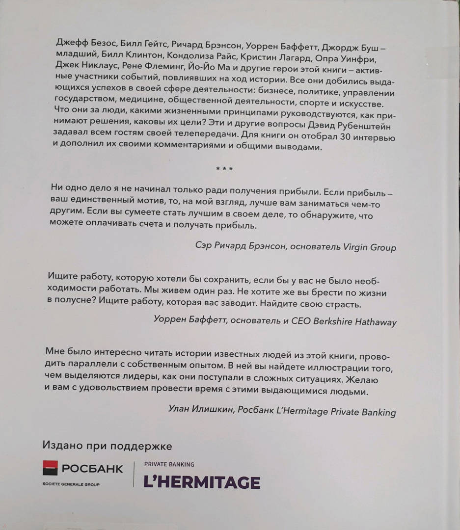 ОписаниеРуководящие принципы и философия Билла Гейтса, Джеффа Безоса, Рут Гинзбург, Уоррена Баффета, Опры Уинфри и многих других влиятельных лидеров.Последние пять лет автор Дэвид М. Рубинштейн - дальновидный соучредитель The Carlyle Group и ведущий шоу - разговаривал с мировыми лидерами о том, кто они и как добились успеха. Дэвид превратил эти откровенные беседы в незаменимое пособие для руководителей.Книга содержит советы и мудрость генеральных директоров, президентов, основателей и ведущих исполнителей из мира финансов (Уоррен Баффет, Джейми Даймон, Кристин Лагард, Кен Гриффин), технологий (Джефф Безос, Билл Гейтс, Эрик Шмидт, Тим Кук), развлечений (Опра Уинфри, Лорн Майклс, Рене Флеминг, Йо-Йо Ма), спорта (Джек Никлаус, Адам Сильвер, тренер К., Фил Найт), правительства (президент Билл Клинтон, президент Джордж Буш, Рут Гинзбург, Нэнси Пелоси) и многих других сфер.Например, внутри вы найдете вдохновляющие истории о новаторских инициаторах перемен. О лучших решениях Джеффа Безоса, которые были приняты сердцем и интуицией, а не анализом. Почему Ричард Брэнсон никогда не начинает бизнес с целью получения прибыли. О Филе Найте, который рассматривает Nike как маркетинговую компанию, продукт которой является ее наиболее важным маркетинговым инструментом. О главе американской военно-промышленной корпорации Lockheed Martin Мэрилин Хьюсон, которая выросла в доме без отца с четырьмя братьями и сестрами в Канзасе, но быстро осознала важность самостоятельности и ценность доллара.Узнайте, как начинался путь выдающихся лидеров и как они справляются с принятием решений, неудачами, инновациями, изменениями и кризисами. Учитесь на их многолетнем опыте пионеров в своей области. Ведь нет двух одинаковых лидеров.Почему решили издать книгу- Права на перевод проданы на 14 языков.- Мудрость и рекомендации ведущих CEO, президентов, предпринимателей и финансистов - от Уоррена Баффета и Кристин Лагард до Джеффа Безоса и Билла Гейтса, от Билла Клинтона до Джорджа Буша.- Автор Дэвид Рубенштейн - соучредитель Carlyle Group, один из самых богатых американцев, долларовый миллиардер, занимается благотворительностью, входит в правление и совет попечителей нескольких университетов США- Бестселлер The New York Times и Wall Street Journal, более 550 отзывов на Амазоне за первые 2 месяца продажДля кого эта книгаДля руководителей и собственников бизнесаСвернутьРуководящие принципы и философия Билла Гейтса, Джеффа Безоса, Рут Гинзбург, Уоррена Баффета, Опры Уинфри и многих других влиятельных лидеров.Последние пять лет автор Дэвид М. Рубинштейн - дальновидный соучредитель The Carlyle Group и ведущий шоу - разговаривал с мировыми лидерами о том, кто они и как добились успеха. Дэвид превратил эти откровенные беседы в незаменимое пособие для руководителей.Книга содержит советы и мудрость генеральных директоров, президентов, основателей и ведущих исполнителей из мира финансов (Уоррен Баффет, Джейми Даймон, Кристин Лагард, Кен Гриффин), технологий (Джефф Безос, Билл Гейтс, Эрик Шмидт, Тим Кук), развлечений (Опра Уинфри, Лорн Майклс, Рене Флеминг, Йо-Йо Ма), спорта (Джек Никлаус, Адам Сильвер, тренер К., Фил Найт), правительства (президент Билл Клинтон, президент Джордж Буш, Рут Гинзбург, Нэнси Пелоси) и многих других сфер.Например, внутри вы найдете вдохновляющие истории о новаторских инициаторах перемен. О лучших решения