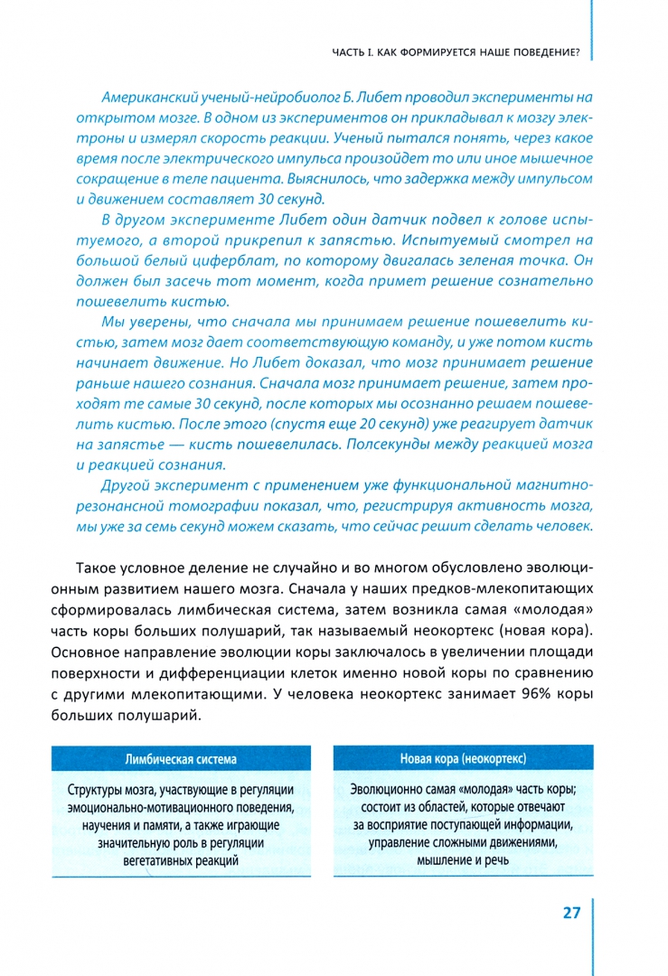 ОписаниеКак часто вы слышите от близких или знакомых, что с понедельника они намерены начать меняться - "бросить курить", "перестать прокрастинировать" или "заняться фитнесом"? Сколько раз вы сами планировали подобное?Но почему-то наши намерения далеко не всегда приводят к желаемому результату. И спустя какое-то время, поддавшись искушению и отступив от намеченного плана, мы снова обещаем себе начать действовать… но уже со следующего понедельника.Эта книга поможет понять, как формируется наше поведение и как его изменить. Вы узнаете, на какие поведенческие модели мы запрограммированы, как возникают нейронные связи, от чего мы на самом деле получаем удовольствие и каким образом не попасть в ловушку выученной беспомощности. Следуя программе упражнений, вы избавитесь от вредной привычки или сформируете новую - полезную.Я очень надеюсь, что с помощью этой книги вы:- поставите точку в бесконечном круговороте обещаний и получите все необходимые знания, чтобы довести начатое дело до конца и не сойти с дистанции на половине пути;- разработаете и реализуете личный проект, который сделает этот долгий и трудоемкий процесс изменений увлекательным и интересным приключением.Александр БадмаевСвернутьКак часто вы слышите от близких или знакомых, что с понедельника они намерены начать меняться - "бросить курить", "перестать прокрастинировать" или "заняться фитнесом"? Сколько раз вы сами планировали подобное?Но почему-то наши намерения далеко не всегда приводят к желаемому результату. И спустя какое-то время, поддавшись искушению и отступив от намеченного плана, мы снова обещаем себе начать действовать… но уже со следующего понедельника.Эта книга поможет понять, как формируется наше поведение и как его изменить. Вы узнаете, на какие поведенческие модели мы запрограммированы, как возникают нейронные связи, от чего мы на самом деле получаем удовольствие и каким образом не попасть в ловушку выученной беспомощности. Следуя программе упражнений, вы избавитесь от вредной привычки или сформируете новую - полезную.Я очень надеюсь, что с помощью этой книги вы:- поставите точку в бесконечном круговороте обещаний и получите все необходимые знания, чтобы довести начатое дело до конца и не сойти с дистанции на половине пути;- разработаете и реализуете личный проект, который сделает этот долгий и трудоемкий процесс изменений увлекательным и интересным приключением.Александр БадмаевСвернутьСвернуть