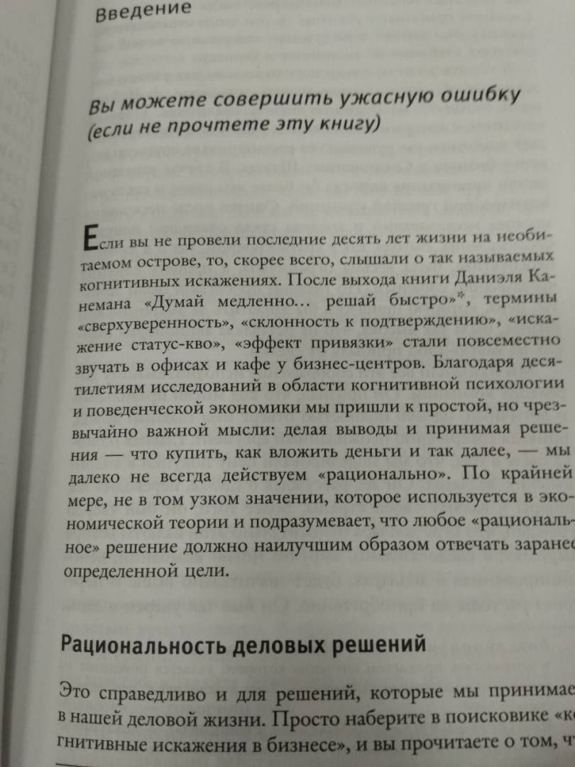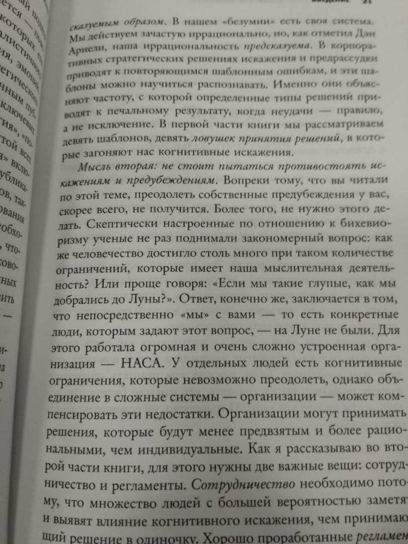 ОписаниеМы постоянно принимаем решения. Это настолько естественно, что в самом процессе мы почти не задумываемся. И часто совершаем предсказуемые ошибки. Стоит ли доверять своей интуиции, и если да, то в каких конкретных случаях? Можно ли избежать когнитивных ловушек, если мы даже не осознаем их? И как сделать самый правильный выбор в бизнесе и жизни? Ответы – на страницах этой книги.Мы постоянно принимаем решения. Это настолько естественно, что в самом процессе мы почти не задумываемся. И часто совершаем предсказуемые ошибки. Стоит ли доверять своей интуиции, и если да, то в каких конкретных случаях? Можно ли избежать когнитивных ловушек, если мы даже не осознаем их? И как сделать самый правильный выбор в бизнесе и жизни? Ответы – на страницах этой книги.