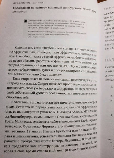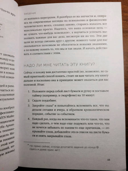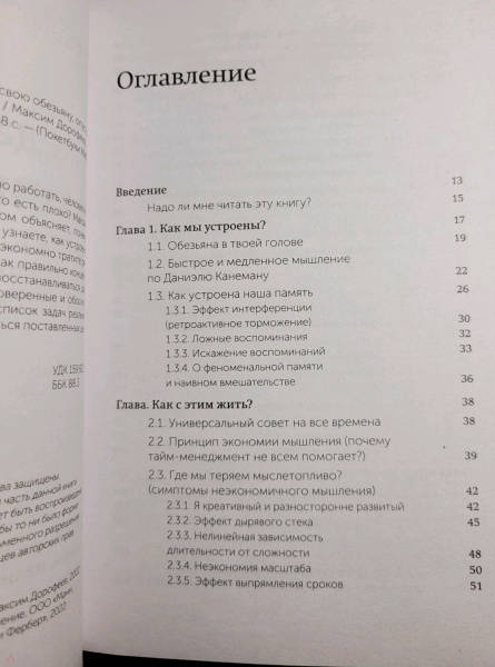 ОписаниеВажная книга о том, как сберечь основной ресурс - мыслетопливо, как сделать список задач реально работающим и гарантированно добиваться результатов. Практичные, проверенные и обоснованные приемы в формате покетбука.Мы все знаем, как надо правильно работать, но у многих из нас все равно есть с этим огромная беда! Мы знаем, что нужно правильно расставлять приоритеты, заниматься сначала первоочередными вещами, не отвлекаться на пустяки, когда заняты важным делом, есть слона частями, лягушку - утром, а отвар летучих мышей принимать на ночь... Мы все это знаем, но по какой-то причине делаем все, как привыкли, то есть плохо. Худшее, что можно сделать в этой ситуации - это начать винить себя в несобранности, в результате чего нажить массу комплексов и работать еще хуже, только при этом еще и начать ненавидеть всех окружающих.Скорее всего, все эти правила и рекомендации не работают по той же причине, по которой ужастики на пачках сигарет не останавливают курильщиков. Видимо, есть что-то эдакое в нашем мозгу, что делает нас такими. В случае курильщиков - это наркотическая зависимость. В случае же неспособности доводить дела до конца - это упущение из виду простых в понимании, но очень важных особенностей работы мышления, которые делают нас не такими уж и рациональными, насколько мы от себя ожидаем.Максим Дорофеев в своей книге доступно объясняет, как мы устроены и почему так происходит. Он собрал тот сплав навыков и знаний, который в свое время спас его мозг от коллапса перегрузок и, опираясь на современные взгляды психологии и физиологии человеческого мозга, донес его до читателя простым языком.Из книги вы узнаетеКак устроено мышление и памятьГде мы теряем мыслетопливо - неэкономно тратим ресурс мозгаКак сохранять мыслетопливо, концентрироваться, правильно формулировать задачи и восстанавливаться для продуктивной работыКак внедрить все полученные знания в жизнь и избежать типичных ошибокНадо ли вам читать эту книгу?Автор предлагает достаточно простой способ понять, стоит ли вам читать эту книгу дальше и насколько она может оказаться для вас полезной. Итак:Поставьте таймер (например, в вашем смартфоне) на 10 минут;Сядьте поудобнее;Закройте глаза и попытайтесь вспомнить все, что вы делали сегодня и вчера, в обратном хронологическом порядке - событие за событием;Каждый раз, когда вы вспоминаете что-то такое, что чуть не забыли - вносите это в список перед собой;Если вы вспомнили сегодняшний и вчерашний день, а будильник еще не прозвенел, продолжайте ждать его звонка с закрытыми глазами.Вам определенно стоит читать эту книгу дальше, если звонок будильника застал вас в любой из следующих ситуаций:- Вы без остановки записывали дела, которые вам срочно надо сделать.- Вы "быстренько отправляли еще одно письмо по электронной почте".- Вы залипли в соцсети, после того как решили "быстренько проверить, что там".- Вы вспомнили об этой книге спустя сутки или больше.Фишки книгиУдобный и качественный формат - книгу можно брать с собой куда угодно.Покетбуки занимают мало места, но приносят много пользы.В серии покетбуков выходят самые важные книги МИФа.Для кого эта книгаДля всех, кто хочет жить и работать продуктивно, без перегрузок и выгорания.Для специалистов и аналитиков, менеджеров, владельцев малого и среднего бизнеса, студентов экономических 
