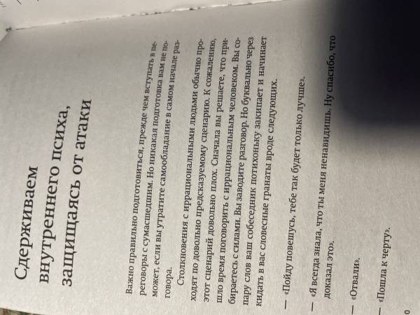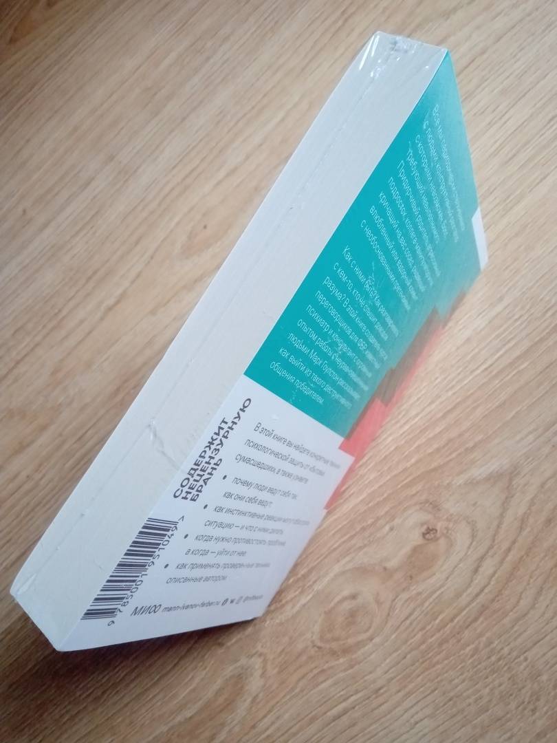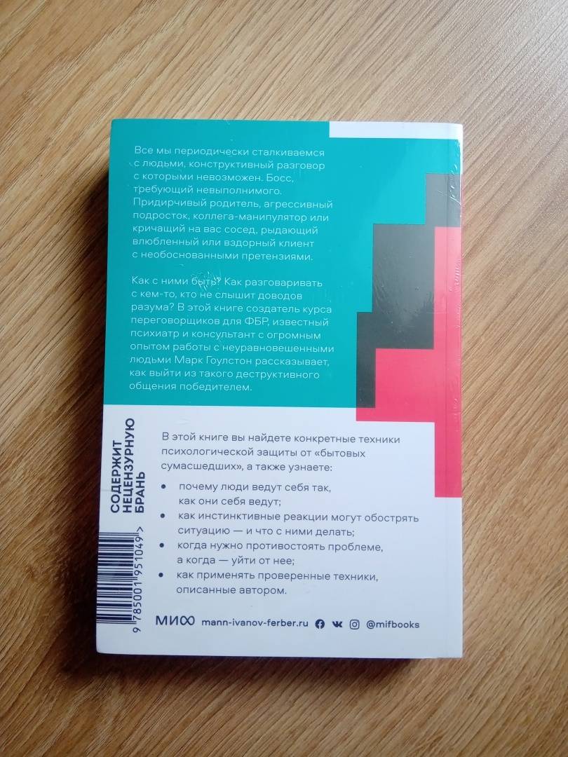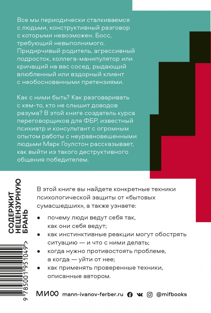 ОписаниеКнига в формате покетбука о том, как вам быть с невыносимыми людьми. Новый формат - для самых важных и любимых книг. Мы сохранили качество: под мягкой обложкой - белая бумага, ляссе и уникальный дизайн. Ничто не помешает наслаждаться чтением без компромиссов.Все мы периодически сталкиваемся с людьми, с которыми конструктивный разговор невозможен. Как с ними быть? Как разговаривать с кем-то, кто вообще неконтролируем? В этой книге известный психиатр и консультант Марк Гоулстон рассказывает, как же выйти из такого деструктивного общения победителем. У него большой опыт работы с неуравновешенными людьми (который позволил ему создать курс переговорщиков для ФБР), и он знает, что традиционные методы общения и аргументации с ними не работают.Это книга о том, как общаться с невыносимыми людьми и сохранять при этом здравый рассудок. В ней вы найдете конкретные техники психологической защиты от "бытовых сумасшедших", заражающих своей иррациональностью и неспособных конструктивно и здраво решить ни один вопрос. Вы узнаете:- Почему люди ведут себя так, как они себя ведут- Как инстинктивные реакции могут обострять ситуацию - и что с ними делать- Когда нужно противостоять проблеме, а когда - уйти от нее- Как применять проверенные техники, описанные автором.Фишки книги- Удобный и качественный формат - книгу можно брать с собой куда угодно.- Покетбуки занимают мало места, но приносят много пользы.- В серии покетбуков выходят самые важные книги МИФа.Для кого эта книгаДля всех, кому приходится общаться с невыносимыми людьми.СвернутьКнига в формате покетбука о том, как вам быть с невыносимыми людьми. Новый формат - для самых важных и любимых книг. Мы сохранили качество: под мягкой обложкой - белая бумага, ляссе и уникальный дизайн. Ничто не помешает наслаждаться чтением без компромиссов.Все мы периодически сталкиваемся с людьми, с которыми конструктивный разговор невозможен. Как с ними быть? Как разговаривать с кем-то, кто вообще неконтролируем? В этой книге известный психиатр и консультант Марк Гоулстон рассказывает, как же выйти из такого деструктивного общения победителем. У него большой опыт работы с неуравновешенными людьми (который позволил ему создать курс переговорщиков для ФБР), и он знает, что традиционные методы общения и аргументации с ними не работают.Это книга о том, как общаться с невыносимыми людьми и сохранять при этом здравый рассудок. В ней вы найдете конкретные техники психологической защиты от "бытовых сумасшедших", заражающих своей иррациональностью и неспособных конструктивно и здраво решить ни один вопрос. Вы узнаете:- Почему люди ведут себя так, как они себя ведут- Как инстинктивные реакции могут обострять ситуацию - и что с ними делать- Когда нужно противостоять проблеме, а когда - уйти от нее- Как применять проверенные техники, описанные автором.Фишки книги- Удобный и качественный формат - книгу можно брать с собой куда угодно.- Покетбуки занимают мало места, но приносят много пользы.- В серии покетбуков выходят самые важные книги МИФа.Для кого эта книгаДля всех, кому приходится общаться с невыносимыми людьми.СвернутьСвернуть