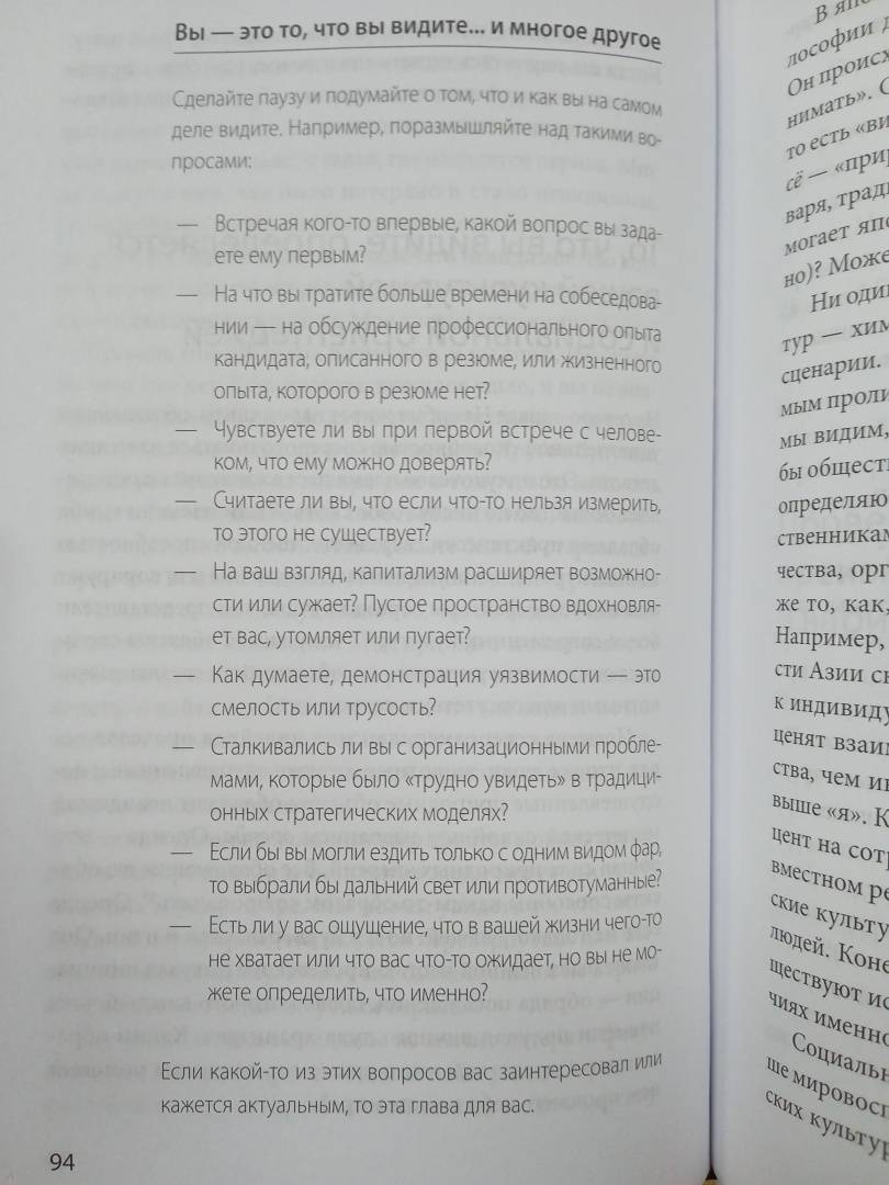 Описание8 принципов, которые помогут руководителям и рядовым сотрудникам не просто выжить, но и быть эффективными в эпоху постоянных перемен. Способность к адаптации и гибкость всегда были отличительными чертами эффективного руководителя. В современном мире, когда темп изменений нарастает все стремительнее, эти качества не просто желательны, они жизненно необходимы. Основная задача - найти прочный смысл посреди непрекращающегося хаоса.Современный мир требует нового стиля мышления, в рамках которого постоянные изменения и неопределенность рассматриваются как некая особенность системы, а не ее сбой. В книге описывается этот новый стиль и рассказывается, как развить восемь "суперспособностей", которые идут вразрез с традиционными представлениями о лидерстве, успехе и благополучии. 1. Двигайтесь медленнее2. Увидьте невидимое3. Теряйтесь4. Начните с доверия5. Знайте свое "достаточно"6. Стройте карьеру в разных областях7. Будьте человечнее и служите людям8. Отпустите будущее Читатели смогут выработать новый взгляд на перемены, найти новые ответы и в конечном счете изменить свое отношение к происходящему. Эта книга поможет каждому: и тем, кто находится на новом витке карьеры, и тем, кто переоценивает ценности, и тем, кто разрабатывает продукт, начинает собственный бизнес, пытается вдохновить своих коллег или стремится к более полной самореализации и желает преуспеть, несмотря на то что почва слишком часто уходит из-под ног.Готовиться к переменам нужно не тогда, когда они наступили, а заранее - во время относительного спокойствия.Свернуть8 принципов, которые помогут руководителям и рядовым сотрудникам не просто выжить, но и быть эффективными в эпоху постоянных перемен. Способность к адаптации и гибкость всегда были отличительными чертами эффективного руководителя. В современном мире, когда темп изменений нарастает все стремительнее, эти качества не просто желательны, они жизненно необходимы. Основная задача - найти прочный смысл посреди непрекращающегося хаоса.Современный мир требует нового стиля мышления, в рамках которого постоянные изменения и неопределенность рассматриваются как некая особенность системы, а не ее сбой. В книге описывается этот новый стиль и рассказывается, как развить восемь "суперспособностей", которые идут вразрез с традиционными представлениями о лидерстве, успехе и благополучии. 1. Двигайтесь медленнее2. Увидьте невидимое3. Теряйтесь4. Начните с доверия5. Знайте свое "достаточно"6. Стройте карьеру в разных областях7. Будьте человечнее и служите людям8. Отпустите будущее Читатели смогут выработать новый взгляд на перемены, найти новые ответы и в конечном счете изменить свое отношение к происходящему. Эта книга поможет каждому: и тем, кто находится на новом витке карьеры, и тем, кто переоценивает ценности, и тем, кто разрабатывает продукт, начинает собственный бизнес, пытается вдохновить своих коллег или стремится к более полной самореализации и желает преуспеть, несмотря на то что почва слишком часто уходит из-под ног.Готовиться к переменам нужно не тогда, когда они наступили, а заранее - во время относительного спокойствия.СвернутьСвернуть