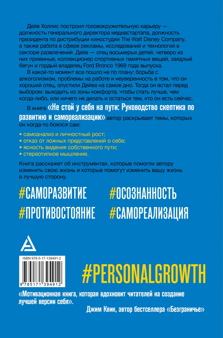 ОписаниеДейв Холлис построил головокружительную карьеру - должность генерального директора медиа-стартапа, должность президента по дистрибуции киностудии The Walt Disney Company, также работа в сфере рекламы, исследований и технологий в секторе развлечений. Дейв - отец восьмерых детей, четверо из них приемные, коллекционер спортивных памятных вещей, заядлый бегун и гордый владелец Ford Bronco 1969 года выпуска.В какой-то момент все пошло не по плану: борьба с алкоголизмом, проблемы на работе и неуверенность в том, что он хороший отец, опустили Дейва на самое дно. Тогда он встал перед выбором: выходить из зоны комфорта, чтобы стать лучше, чем когда-либо, или ничего не делать и остаться тем, кто он есть сейчас.В книге "Не стой у себя на пути" автор раскрывает темы, которых он когда-то боялся сам:o самоанализ и личностный рост;o отказ от ложных представлений о себе;o ясность видения собственного пути;o стереотипное мышление.Книга расскажет об инструментах, которые помогли автору изменить свою жизнь и которые помогут изменить вашу жизнь в лучшую сторону.Будь тверже и уверенне на пути непредвиденных обстоятельств. И помни - ты не один!