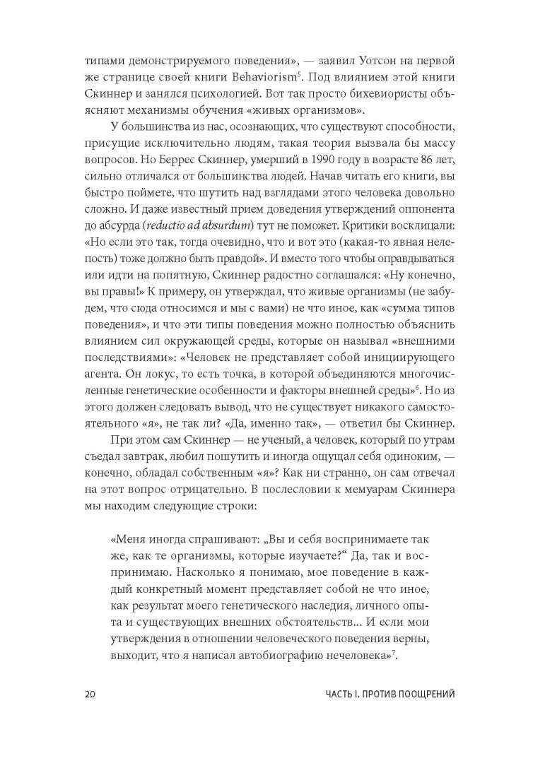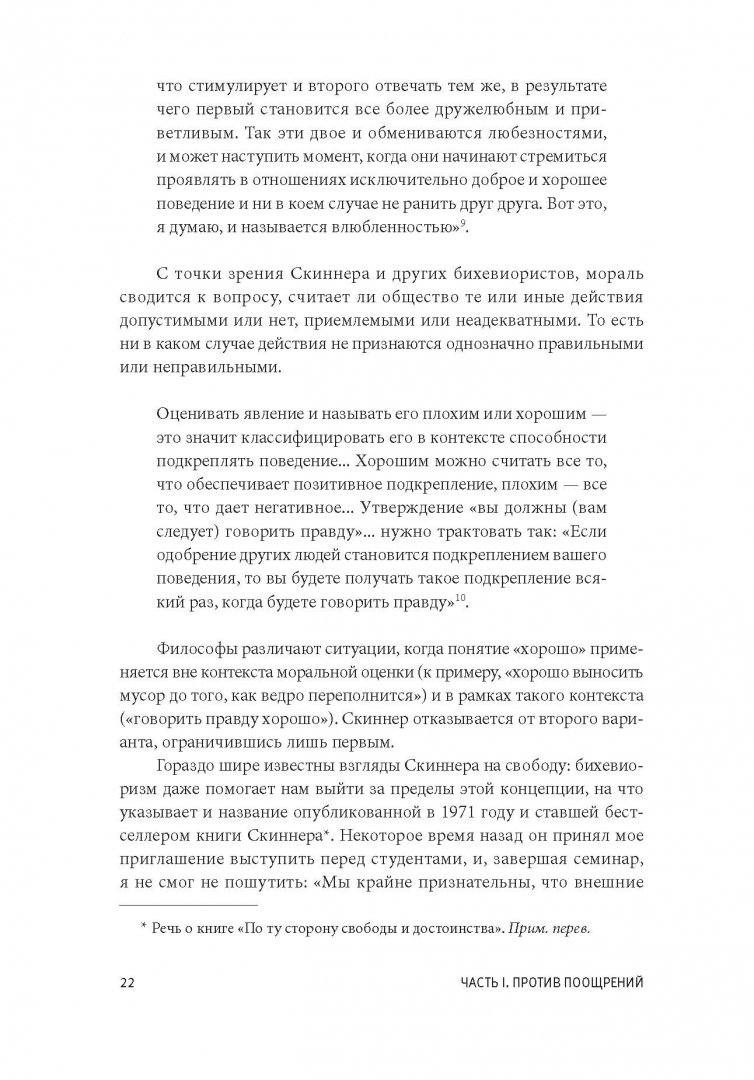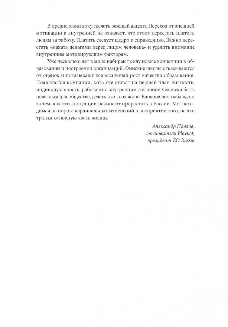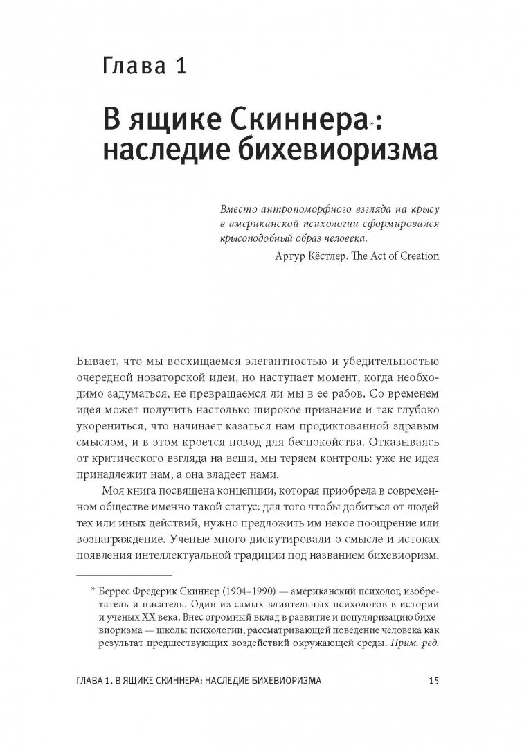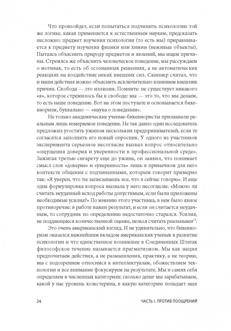 ОписаниеО книгеБазовая стратегия, которую мы используем в воспитании, образовании и управлении - "сделай то - и получишь это" - неверна. Эта книга объясняет почему.Прибегая к поощрениям как к средству решения проблемы, мы не разбираемся в причинах того, что ее вызвало. Награда - это уловка, с ее помощью можно устранить симптом, но не вылечить болезнь.В своей книге известный психолог Альфи Кон подробно объясняет, почему отношения с детьми, учениками и подчиненными нельзя строить по принципу: "Сделай то - и получишь это". Он показывает, насколько страшен и губителен такой подход и к каким последствиям приводят подобного рода манипуляции и попытки исправить поведение другого человека (ребенка или сотрудника).Кон уверен: поощрение людей за подчинение требованиям - это вовсе не "принцип устройства мира", как считают многие, и не фундаментальный закон человеческих отношений. Это лишь один из способов мышления, организации собственного опыта и взаимодействия с другими. Кому-то из нас такая логика взаимодействия может казаться вполне естественной, но в реальности она является проявлением вполне конкретной идеологии, которую можно обсуждать и подвергать критике.Если вы воспитываете детей, преподаете или управляете людьми - вам нужно прочитать эту книгу. Благодаря юмору автора, понятным и знакомым примерам и доступному изложению чтение будет не только полезным, но и приятным.3 причины прочитать эту книгуЭта книга бросает вызов классическому подходу к мотивации в воспитании и управлении. Вы будете смотреть на мотивацию иначе.Она написана в доступном стиле и с интересными примерами.Книга продается и переиздается на протяжении 18 лет.Для кого эта книгаДля родителей, учителей, преподавателей, воспитателей, руководителей и менеджеров.Об автореАльфи Кон - известный психолог, лектор, независимый исследователь в области образования и человеческого поведения. Автор 14 книг, лауреат нескольких профессиональных премий.СвернутьО книгеБазовая стратегия, которую мы используем в воспитании, образовании и управлении - "сделай то - и получишь это" - неверна. Эта книга объясняет почему.Прибегая к поощрениям как к средству решения проблемы, мы не разбираемся в причинах того, что ее вызвало. Награда - это уловка, с ее помощью можно устранить симптом, но не вылечить болезнь.В своей книге известный психолог Альфи Кон подробно объясняет, почему отношения с детьми, учениками и подчиненными нельзя строить по принципу: "Сделай то - и получишь это". Он показывает, насколько страшен и губителен такой подход и к каким последствиям приводят подобного рода манипуляции и попытки исправить поведение другого человека (ребенка или сотрудника).Кон уверен: поощрение людей за подчинение требованиям - это вовсе не "принцип устройства мира", как считают многие, и не фундаментальный закон человеческих отношений. Это лишь один из способов мышления, организации собственного опыта и взаимодействия с другими. Кому-то из нас такая логика взаимодействия может казаться вполне естественной, но в реальности она является проявлением вполне конкретной идеологии, которую можно обсуждать и подвергать критике.Если вы воспитываете детей, преподаете или управляете людьми - вам нужно прочитать эту книгу. Благодаря юмору автора, понятным и знакомым примерам и доступному изложению чтение 