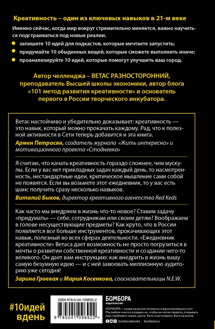 ОписаниеТворческий блокнот от преподавателя ВШЭ, директора по маркетингу школы инноваций ИКРА, основатель творческого инкубатора Creative Happens. Блокнот поможет развить гибкость Креативность — один из ключевых навыков в 21 веке. Навык генерировать новые идеи, а главное, воплощать их в жизнь, необходим каждому успешному человеку. Именно сейчас, когда мир вокруг стремительно меняется, важно научиться подстраиваться под новые реалии.Каждый разворот "Есть идея!" — это задание на один день. Положите книгу и карандаш рядом с вашей кроватью. Сразу после пробуждения не тянитесь к смартфону, а берите книгу, открывайте на любой странице и выполняйте всего одно задание. На страницах вы найдете задания на каждый день: от просьбы придумать 10 идей для собственного подкаста до 10 идей, которые помогут улучшить ваш город. Всего за 101 день вы сможете повысить свой уровень креативности вместе с Ветасом Разносторонним, настоящим специалистом в области брейнсторма и вдохновения. Автор много лет изучал методолгию креативного решения задач, чтобы поделиться с вами этими знаниями. Автор метода — Виталий Микрюков (он же Ветас Разносторонний), преподаватель Высшей Школы Экономики, автор блога "101 метод развития креативности" и основатель первого в России творческого инкубатора.СвернутьТворческий блокнот от преподавателя ВШЭ, директора по маркетингу школы инноваций ИКРА, основатель творческого инкубатора Creative Happens. Блокнот поможет развить гибкость Креативность — один из ключевых навыков в 21 веке. Навык генерировать новые идеи, а главное, воплощать их в жизнь, необходим каждому успешному человеку. Именно сейчас, когда мир вокруг стремительно меняется, важно научиться подстраиваться под новые реалии.Каждый разворот "Есть идея!" — это задание на один день. Положите книгу и карандаш рядом с вашей кроватью. Сразу после пробуждения не тянитесь к смартфону, а берите книгу, открывайте на любой странице и выполняйте всего одно задание. На страницах вы найдете задания на каждый день: от просьбы придумать 10 идей для собственного подкаста до 10 идей, которые помогут улучшить ваш город. Всего за 101 день вы сможете повысить свой уровень креативности вместе с Ветасом Разносторонним, настоящим специалистом в области брейнсторма и вдохновения. Автор много лет изучал методолгию креативного решения задач, чтобы поделиться с вами этими знаниями. Автор метода — Виталий Микрюков (он же Ветас Разносторонний), преподаватель Высшей Школы Экономики, автор блога "101 метод развития креативности" и основатель первого в России творческого инкубатора.СвернутьСвернуть
