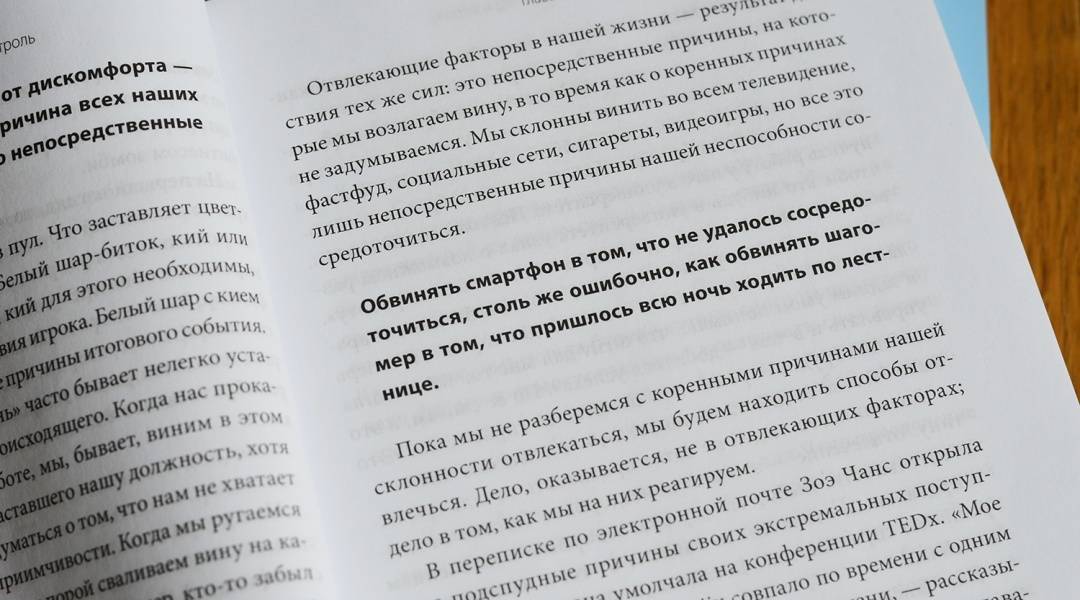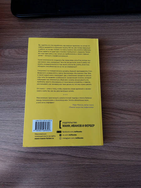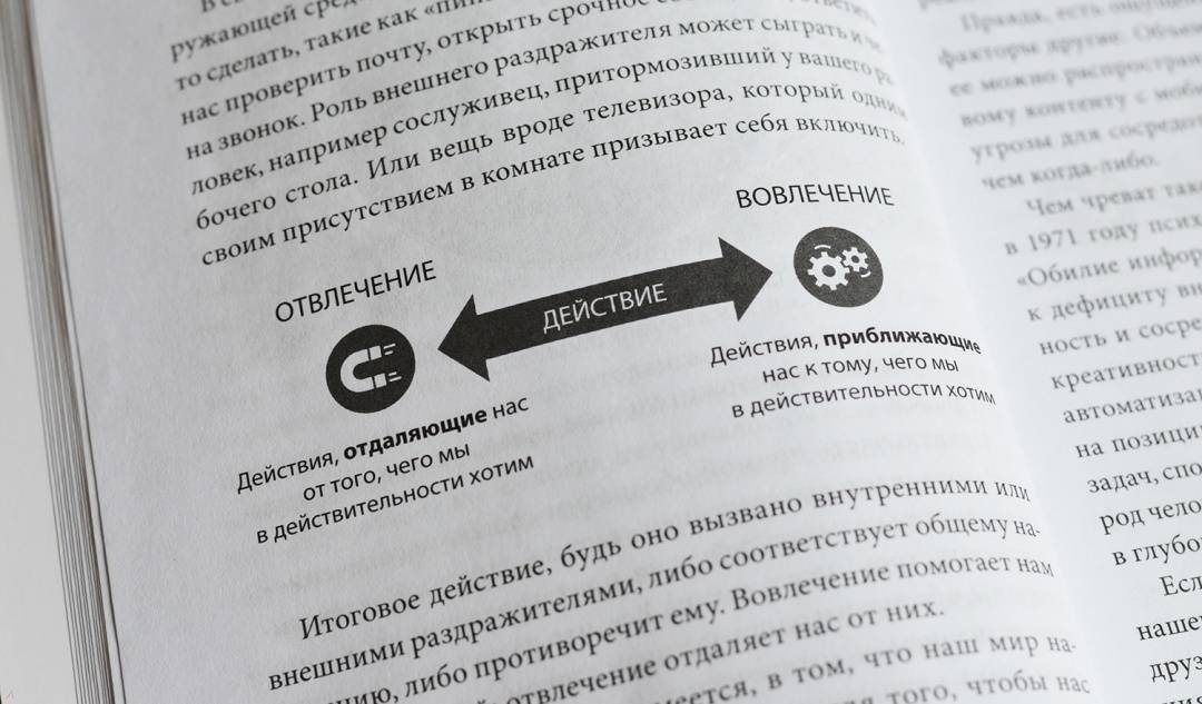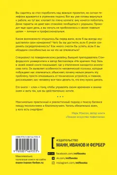 ОписаниеЭта книга - ключ к тому, как выжать максимум из технологий, не давая им выжать максимум из нас.Нир Эяль, который в бестселлере "На крючке" рассказал, как бренды цепляют наше внимание, в новой книге объясняет, как не попадаться на тот самый крючок, удерживая внимание на по-настоящему важных вещах.Эяль выявляет особенности человеческой психики, которые побуждают нас отвлекаться. Он рассказывает, почему проблему нельзя решить, просто отказавшись от технических устройств. Воздержание в данном случае невозможно и заставляет нас хотеть большего.Но у отвлечений есть ахиллесова пята. Эяль раскрывает секрет, как человеку все-таки делать то, что он решил делать. Ответ - в авторской четырехступенчатой модели, в основу которой положены результаты многочисленных исследований.Прочитав книгу, вы узнаете:- почему отвлечение на рабочем месте - симптом ущербности корпоративной культуры и как с ним справиться;- что на самом деле движет человеком, когда он поступает так или иначе, и почему "управление временем есть управление страданием";- почему ваши отношения (и сексуальная жизнь) зависят от того, способны ли вы не отвлекаться;- как вырастить сосредоточенных детей в мире, где отвлекающих факторов становится все больше.Все вместе - новаторские приемы, которые позволят вам управлять временем и вниманием и жить так, как вы хотите.Для кого эта книгаДля тех, кто хочет сосредоточиться и достигать максимумаДля тех, кто страдает от расфокусировки вниманияДля тех, кто слишком много времени проводит с гаджетамиСвернутьЭта книга - ключ к тому, как выжать максимум из технологий, не давая им выжать максимум из нас.Нир Эяль, который в бестселлере "На крючке" рассказал, как бренды цепляют наше внимание, в новой книге объясняет, как не попадаться на тот самый крючок, удерживая внимание на по-настоящему важных вещах.Эяль выявляет особенности человеческой психики, которые побуждают нас отвлекаться. Он рассказывает, почему проблему нельзя решить, просто отказавшись от технических устройств. Воздержание в данном случае невозможно и заставляет нас хотеть большего.Но у отвлечений есть ахиллесова пята. Эяль раскрывает секрет, как человеку все-таки делать то, что он решил делать. Ответ - в авторской четырехступенчатой модели, в основу которой положены результаты многочисленных исследований.Прочитав книгу, вы узнаете:- почему отвлечение на рабочем месте - симптом ущербности корпоративной культуры и как с ним справиться;- что на самом деле движет человеком, когда он поступает так или иначе, и почему "управление временем есть управление страданием";- почему ваши отношения (и сексуальная жизнь) зависят от того, способны ли вы не отвлекаться;- как вырастить сосредоточенных детей в мире, где отвлекающих факторов становится все больше.Все вместе - новаторские приемы, которые позволят вам управлять временем и вниманием и жить так, как вы хотите.Для кого эта книгаДля тех, кто хочет сосредоточиться и достигать максимумаДля тех, кто страдает от расфокусировки вниманияДля тех, кто слишком много времени проводит с гаджетамиСвернутьСвернуть