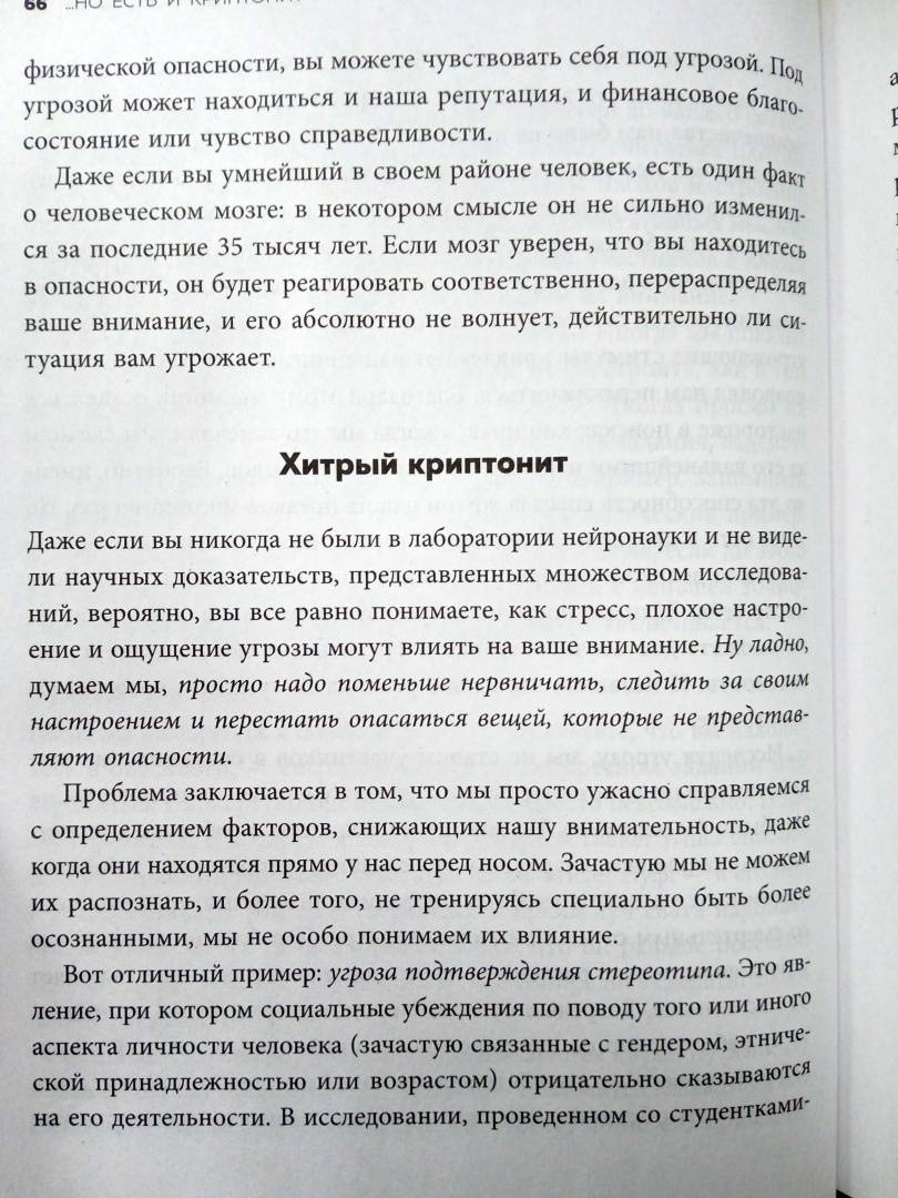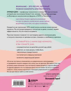 ОписаниеПредставьте свою жизнь в виде лоскутного одеяла, в котором каждый квадратик - определенный момент. Вот вы наливаете чашку кофе, а здесь - смеетесь с друзьями. А теперь представьте, что рвете половину одеяла. Остальные воспоминания исчезли, и, скорее всего, вы этого даже не заметите. Почему? Вы просто не обращали на них внимания.Нам очень трудно удержать внимание. Скорее всего, даже сейчас, читая этот текст, вы думаете о чем-то другом и с трудом вспомните содержание предыдущего абзаца. И так во всем. Вы упускаете 50% своей жизни, включая самые важные моменты.Но есть и хорошая новость: с вами все в порядке. Человеческий мозг создан для того, чтобы его можно было отвлечь.Вы еще здесь? Есть новость еще лучше: вы можете научиться эффективно концентрировать внимание и получать максимум от деловой встречи, планерок и свободного времени. Вы выведете продуктивность на новый уровень.Оставайтесь с нами еще немного, и вы узнаете, как:- сосредоточиться на деле без больших усилий;- работать на пике разума, чтобы быть максимально продуктивным; - не попасться в ловушку внимания;- включить сверхмощный режим.Об автореАмиши Джа - профессор психологии и спикер TED, выступление которой уже посмотрели более 5 млн людей. Ее книга - бестселлер Amazon.СвернутьПредставьте свою жизнь в виде лоскутного одеяла, в котором каждый квадратик - определенный момент. Вот вы наливаете чашку кофе, а здесь - смеетесь с друзьями. А теперь представьте, что рвете половину одеяла. Остальные воспоминания исчезли, и, скорее всего, вы этого даже не заметите. Почему? Вы просто не обращали на них внимания.Нам очень трудно удержать внимание. Скорее всего, даже сейчас, читая этот текст, вы думаете о чем-то другом и с трудом вспомните содержание предыдущего абзаца. И так во всем. Вы упускаете 50% своей жизни, включая самые важные моменты.Но есть и хорошая новость: с вами все в порядке. Человеческий мозг создан для того, чтобы его можно было отвлечь.Вы еще здесь? Есть новость еще лучше: вы можете научиться эффективно концентрировать внимание и получать максимум от деловой встречи, планерок и свободного времени. Вы выведете продуктивность на новый уровень.Оставайтесь с нами еще немного, и вы узнаете, как:- сосредоточиться на деле без больших усилий;- работать на пике разума, чтобы быть максимально продуктивным; - не попасться в ловушку внимания;- включить сверхмощный режим.Об автореАмиши Джа - профессор психологии и спикер TED, выступление которой уже посмотрели более 5 млн людей. Ее книга - бестселлер Amazon.СвернутьСвернуть