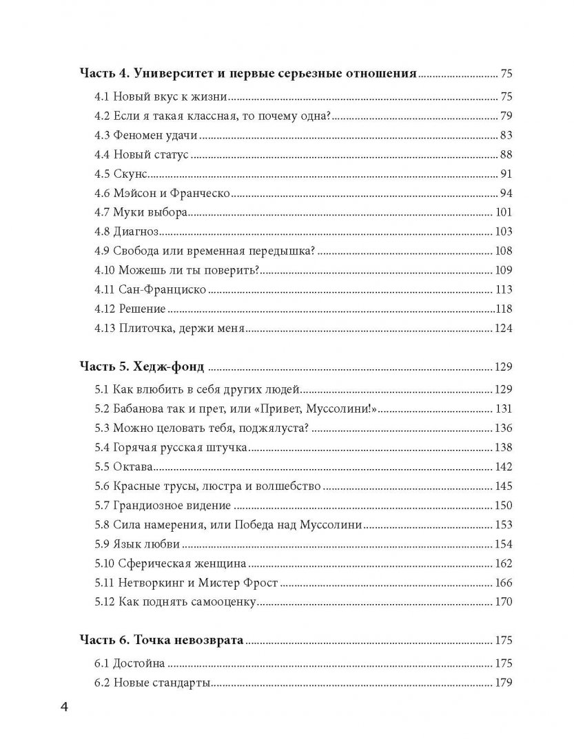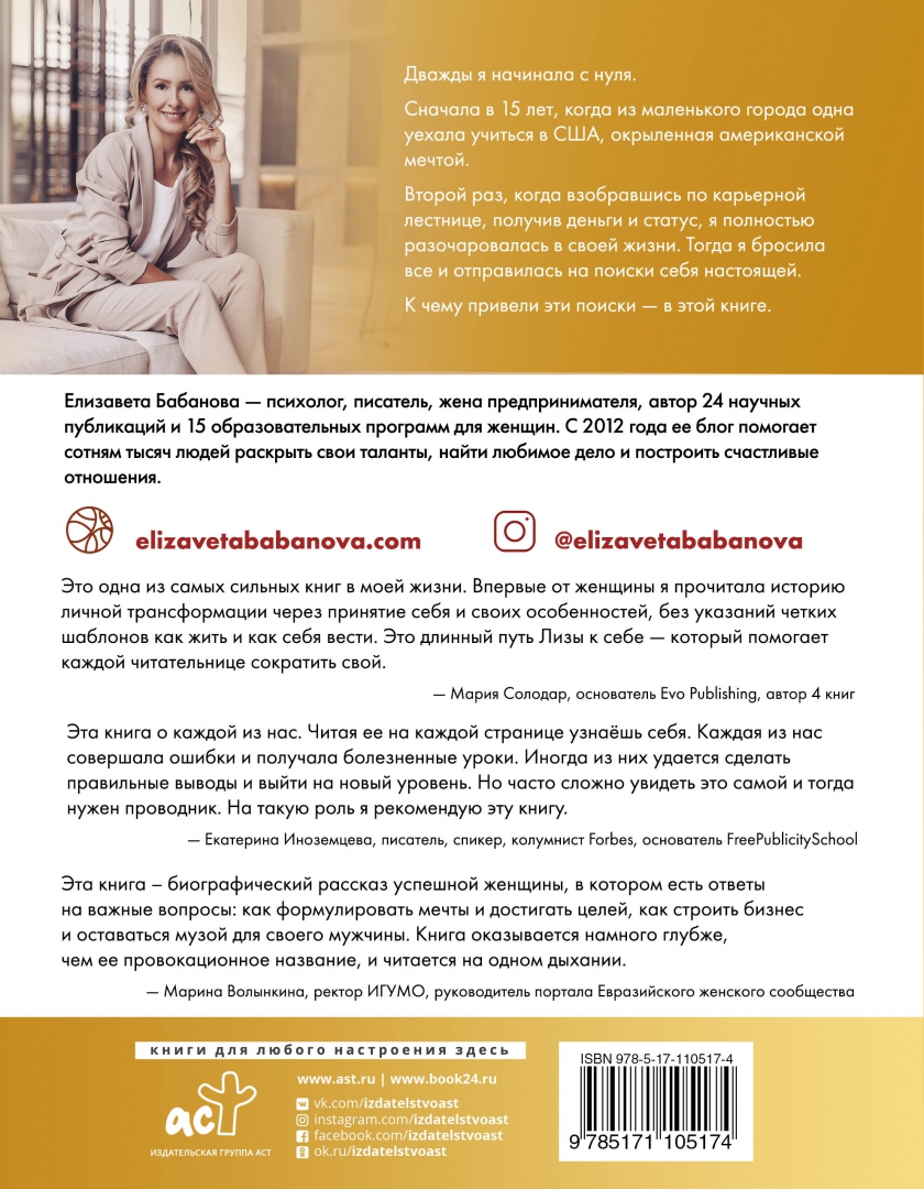 ОписаниеЕлизавета Бабанова - психолог, писатель, жена предпринимателя, автор 24 научных публикаций и 15 образовательных программ для женщин. С 2012 года ее блог помогает сотням тысяч людей раскрыть свои таланты, найти любимое дело и построить счастливые отношения.Если вы ищете себя, свое дело, своего мужчину - вливайтесь в сообщество современных женщин, где вы найдете поддержку в достижении ваших самых дерзких целей.Дважды я начинала с нуля.Сначала в 15 лет, когда из маленького города одна уехала учиться в США, окрыленная американской мечтой. Второй раз, когда взобравшись по карьерной лестнице, получив деньги и статус, я полностью разочаровалась в своей жизни. Тогда я бросила все и отправилась на поиски себя настоящей.К чему привели эти поиски - в этой книге.Елизавета Бабанова - психолог, писатель, жена предпринимателя, автор 24 научных публикаций и 15 образовательных программ для женщин. С 2012 года ее блог помогает сотням тысяч людей раскрыть свои таланты, найти любимое дело и построить счастливые отношения.Если вы ищете себя, свое дело, своего мужчину - вливайтесь в сообщество современных женщин, где вы найдете поддержку в достижении ваших самых дерзких целей.Дважды я начинала с нуля.Сначала в 15 лет, когда из маленького города одна уехала учиться в США, окрыленная американской мечтой. Второй раз, когда взобравшись по карьерной лестнице, получив деньги и статус, я полностью разочаровалась в своей жизни. Тогда я бросила все и отправилась на поиски себя настоящей.К чему привели эти поиски - в этой книге.