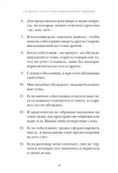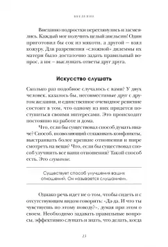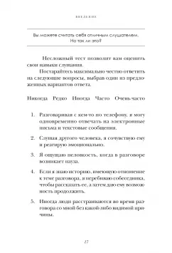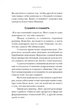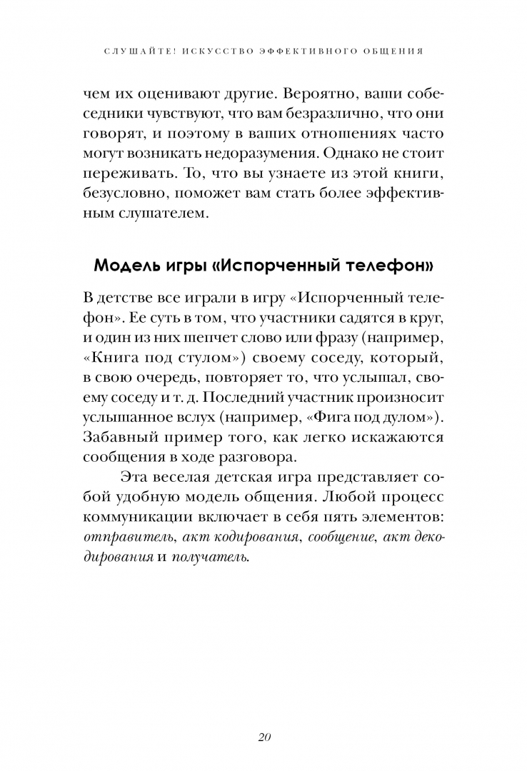 ОписаниеПочему порой так сложно понять друг друга в общении с коллегами, членами семьи или друзьями? Умение по-настоящему слушать другого человека - это самый важный навык, способный помочь вам изменить свою жизнь, стать увереннее, доброжелательнее и достичь успеха. Именно поэтому так ценна книга, которую вы держите в руках. Она поможет пройти путь от простого физиологического слышания к эффективному слушанию, включающему в себя еще и понимание. Это искусство, которому можно научиться. В конце концов, что есть искусство, как не постоянное совершенствование тех или иных навыков! Приводя яркие примеры и предлагая простые в освоении приемы общения и практические упражнения, авторы покажут вам, как стать идеальным собеседником.Почему порой так сложно понять друг друга в общении с коллегами, членами семьи или друзьями? Умение по-настоящему слушать другого человека - это самый важный навык, способный помочь вам изменить свою жизнь, стать увереннее, доброжелательнее и достичь успеха. Именно поэтому так ценна книга, которую вы держите в руках. Она поможет пройти путь от простого физиологического слышания к эффективному слушанию, включающему в себя еще и понимание. Это искусство, которому можно научиться. В конце концов, что есть искусство, как не постоянное совершенствование тех или иных навыков! Приводя яркие примеры и предлагая простые в освоении приемы общения и практические упражнения, авторы покажут вам, как стать идеальным собеседником.