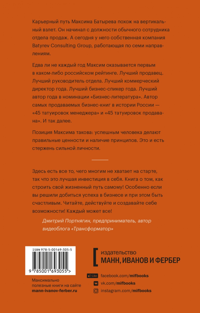 ОписаниеБестселлер "45 татуировок личности" в удобном формате покетбука. Книга о саморазвитии и личностном росте поможет как в самом начале пути, так и людям с опытом.Имя Максима Батырева широко известно в российском бизнес-сообществе. Его карьерный путь можно без преувеличения назвать выдающимся. Рядовая должность сотрудника отдела продаж - в начале пути. Собственная компания Batyrev Consulting Group, работающая по семи направлениям, - сегодня.Лучший продавец. Лучший руководитель отдела. Лучший коммерческий директор года России. Лучший автор года России в номинации "Бизнес-литература". Лучший бизнес-спикер года. Автор одних из самых продаваемых бизнес-книг в России - "45 татуировок менеджера" и "45 татуировок продавана". Максим Батырев уверен, что это лишь начало большого жизненного пути.Такие достижения не приходят сами собой. За ними стоит тяжелая работа, ошибки и "шишки", уроки и выводы. Многие из них навсегда врезаются в сердце и сознание, словно татуировки. 45 своих "татуировок", ставших правилами жизни, Максим Батырев открывает в этой книге. Из каждого эпизода жизни он выводит принципы взаимодействия с миром, семьей, самим собой - и все удачи и трудности складываются в картину того, как в любой ситуации оставаться собой и шагать все выше по лестнице саморазвития.Наверняка многие из этих правил вы сможете применить в своей жизни. И наверняка найдете, чем их дополнить.Фишки книгиУдобный и качественный формат - книгу можно брать с собой куда угодно.Покетбуки занимают мало места, но приносят много пользы.В серии покетбуков выходят самые важные книги МИФа.Есть закладка-ляссе, а значит, вы всегда сможете продолжить читать книгу с того места, где остановились.От автораЯ просто человек со своими сильными сторонами и слабостями, преимуществами и недостатками, победами и поражениями, переживаниями и парой живущих в глубинах мозга тараканов, которые ругаются не только на меня, но и друг с другом.Я считаю, что чем больше принципов у человека, тем он целостнее, тем прочнее его внутренний стержень и тем ближе он к тем, кого принято называть атлантами, стоиками или гипербореями. Принципы делают человека сильным. Именно люди с принципами строили города, выигрывали войны, запускали ракеты в космос, создавали науки и формулировали законы. Именно люди с принципами оставляли след в этом мире и входили в историю.Для кого эта книгаДля всех, кто находится в начале осознанного пути к успеху.СвернутьБестселлер "45 татуировок личности" в удобном формате покетбука. Книга о саморазвитии и личностном росте поможет как в самом начале пути, так и людям с опытом.Имя Максима Батырева широко известно в российском бизнес-сообществе. Его карьерный путь можно без преувеличения назвать выдающимся. Рядовая должность сотрудника отдела продаж - в начале пути. Собственная компания Batyrev Consulting Group, работающая по семи направлениям, - сегодня.Лучший продавец. Лучший руководитель отдела. Лучший коммерческий директор года России. Лучший автор года России в номинации "Бизнес-литература". Лучший бизнес-спикер года. Автор одних из самых продаваемых бизнес-книг в России - "45 татуировок менеджера" и "45 татуировок продавана". Максим Батырев уверен, что это лишь начало большого жизненного пути.Такие достижения не приходят сами собой. За ними стоит тяжелая работа, ошибки и "шишки", уроки и выводы.