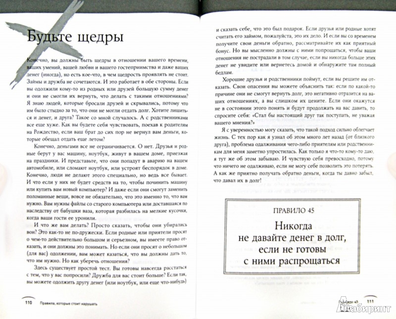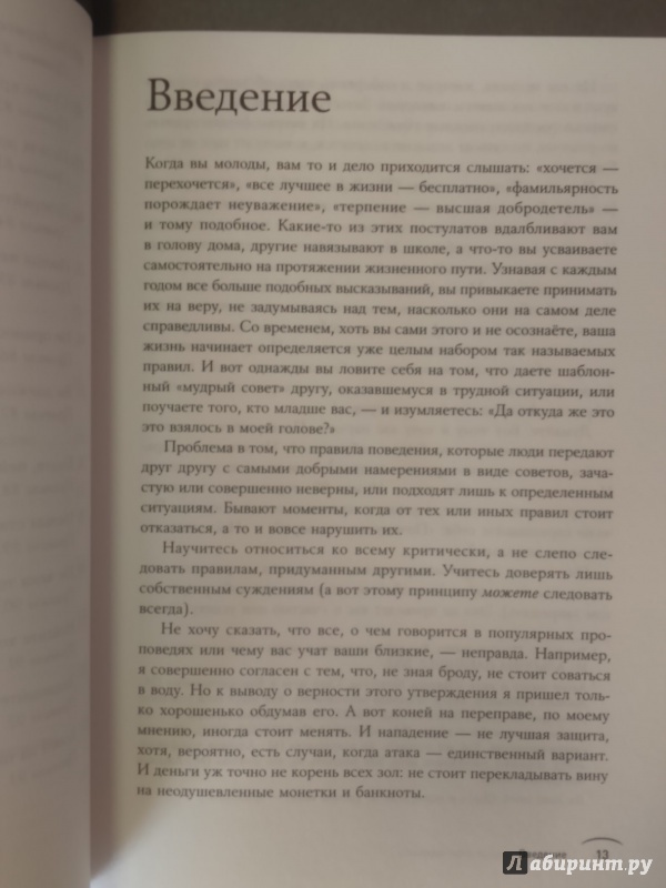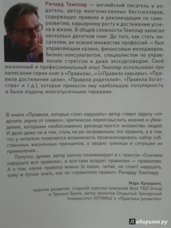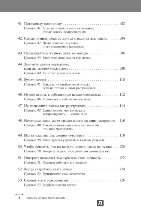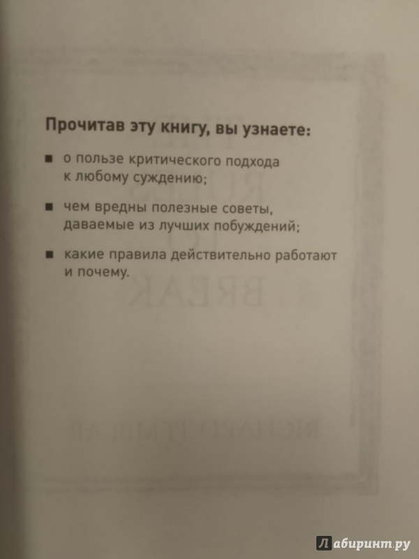 ОписаниеНаша жизнь часто определяется набором внушаемых с детства правил: "Очень важно хорошо учиться", "Всегда слушайся старших", "Надо стремиться к совершенству" и т. д. Многие из них спорны, а порой просто неверно нами понимаются, что не мешает им серьезно влиять на нашу жизнь, осознаем мы это или нет. В своей новой книге всемирно известный автор бестселлеров по саморазвитию Ричард Темплар развенчивает самые распространенные из этих правил, рассказывая, почему ни одно из них не стоит принимать на веру. Он предлагает читателям больше не мыслить шаблонно и адекватно реагировать на "добрые советы" окружающих.Наша жизнь часто определяется набором внушаемых с детства правил: "Очень важно хорошо учиться", "Всегда слушайся старших", "Надо стремиться к совершенству" и т. д. Многие из них спорны, а порой просто неверно нами понимаются, что не мешает им серьезно влиять на нашу жизнь, осознаем мы это или нет. В своей новой книге всемирно известный автор бестселлеров по саморазвитию Ричард Темплар развенчивает самые распространенные из этих правил, рассказывая, почему ни одно из них не стоит принимать на веру. Он предлагает читателям больше не мыслить шаблонно и адекватно реагировать на "добрые советы" окружающих.