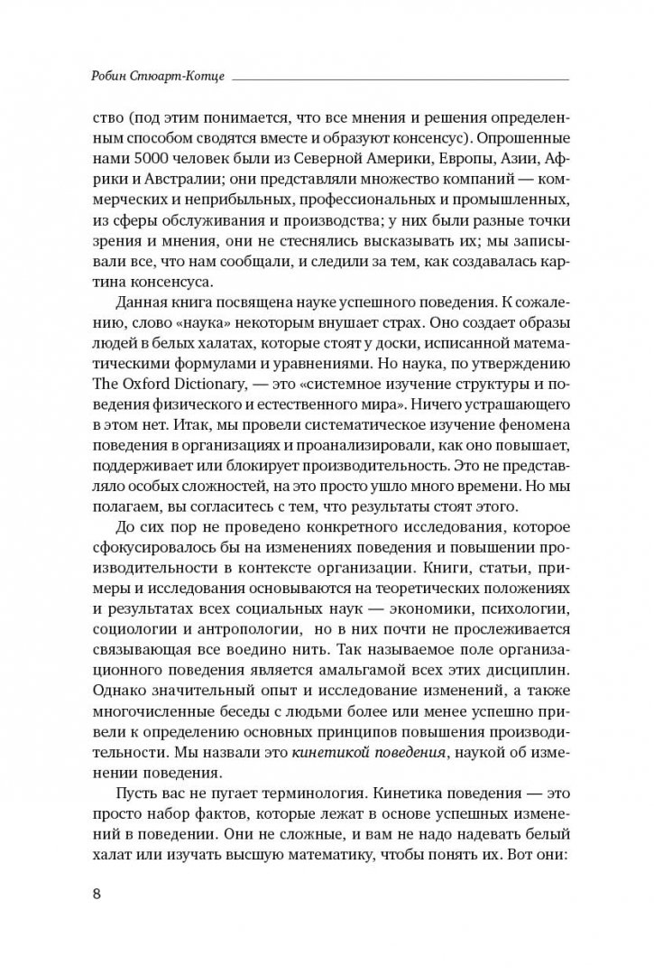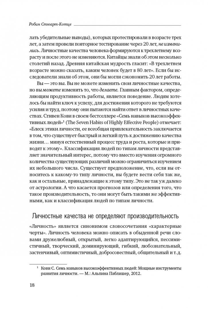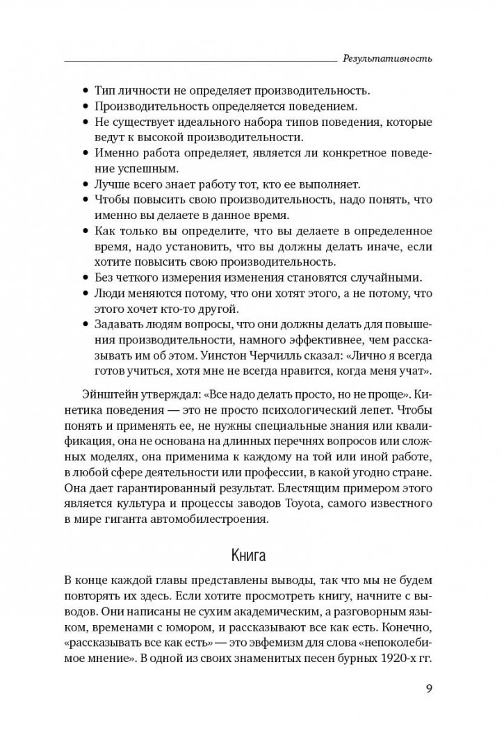 ОписаниеНаша профессиональная деятельность, как правило, предполагает целый спектр ежедневных действий, но какие из них в действительности приносят пользу? А если вы руководите другими людьми, как вы способствуете повышению производительности их труда? Производительность труда большей частью зависит от поведения, в то время как личностный фактор не играет важной роли. Фундаментальные исследования показывают, что личность объясняет менее 10 % отклонений в поведении человека. Поведение - это действия, которые вы предпринимаете, и решения, которые вы принимаете. Им можно управлять: можно решить, что делать и когда. Можно увидеть результат и оценить его. Фактически результативность - это выполнение нужных действий в нужное время. Эта книга расскажет вам, как критически рассматривать свое поведение в данный момент времени, как определять, что следует делать иначе, как сознательно улучшать свое поведение, чтобы соответствовать быстро меняющимся профессиональным требованиям и достигать высокой производительности труда. Книга "Результативность" - ключ к секретам кинетики поведения.СвернутьНаша профессиональная деятельность, как правило, предполагает целый спектр ежедневных действий, но какие из них в действительности приносят пользу? А если вы руководите другими людьми, как вы способствуете повышению производительности их труда? Производительность труда большей частью зависит от поведения, в то время как личностный фактор не играет важной роли. Фундаментальные исследования показывают, что личность объясняет менее 10 % отклонений в поведении человека. Поведение - это действия, которые вы предпринимаете, и решения, которые вы принимаете. Им можно управлять: можно решить, что делать и когда. Можно увидеть результат и оценить его. Фактически результативность - это выполнение нужных действий в нужное время. Эта книга расскажет вам, как критически рассматривать свое поведение в данный момент времени, как определять, что следует делать иначе, как сознательно улучшать свое поведение, чтобы соответствовать быстро меняющимся профессиональным требованиям и достигать высокой производительности труда. Книга "Результативность" - ключ к секретам кинетики поведения.СвернутьСвернуть