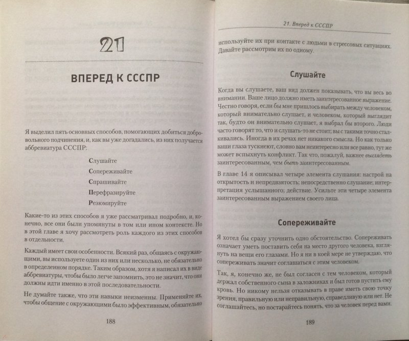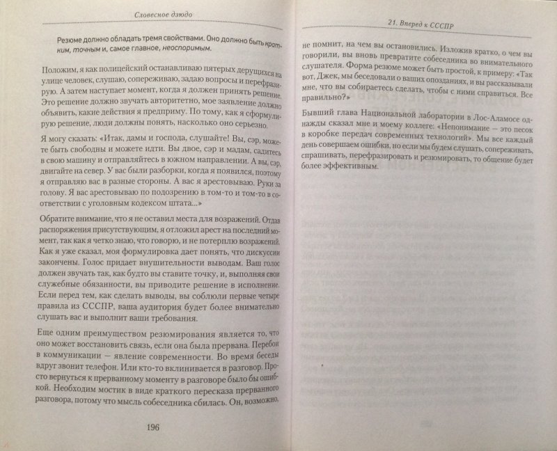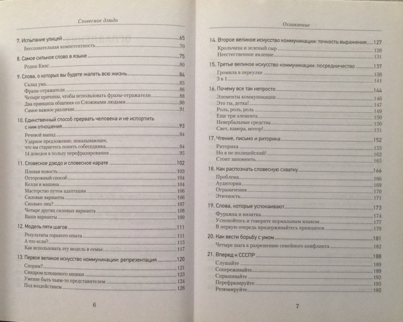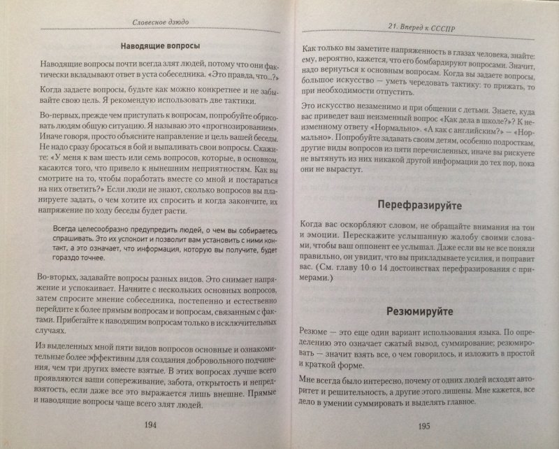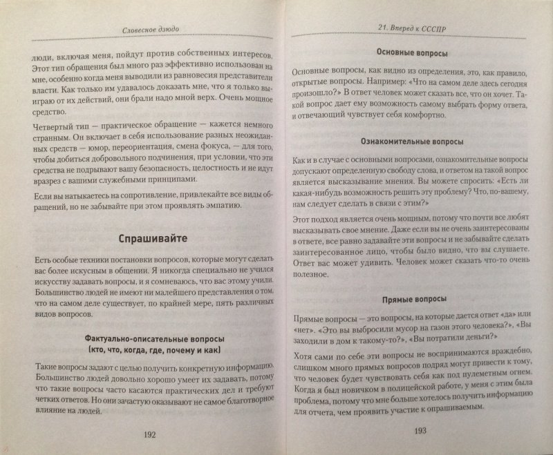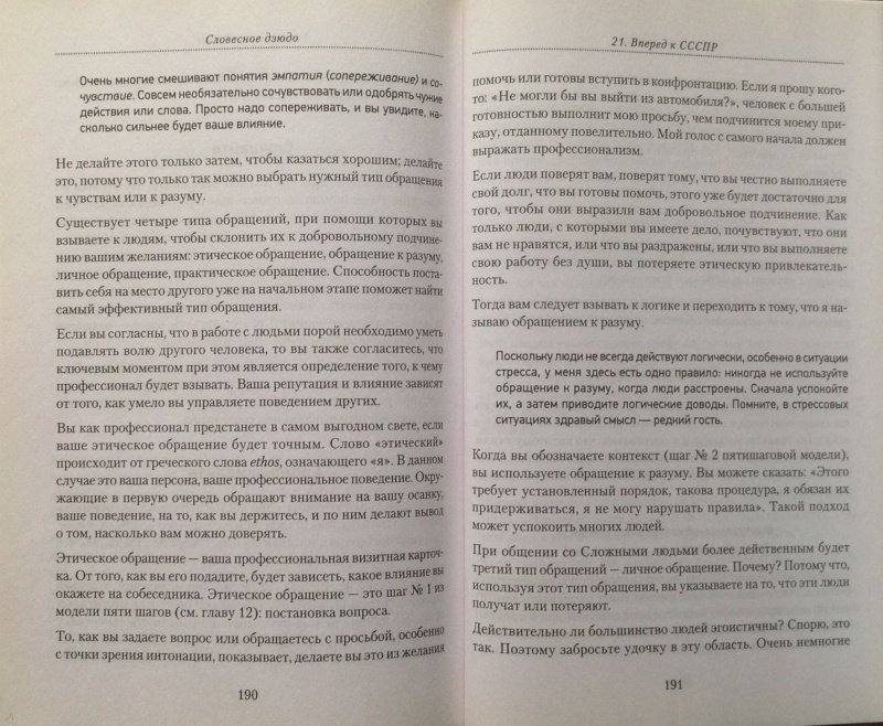 ОписаниеСловесное дзюдо - это мягкое боевое искусство разума и речи, которое поможет вам поладить с любым человеком, от уборщицы до президента. Слушать, говорить, привлекать окружающих, избегать досадных ошибок во время разговора, пользоваться проверенными стратегиями в общении с другими людьми - все это необходимо каждому. Прочитав эту книгу, вы научитесь: общаться с самыми трудными собеседниками, не используя прессинг и грубую силу; креативно подходить к любым разногласиям; находить простые решения в самых сложных ситуациях; пользоваться нужными словами для достижения своих целей; избегать фраз, выражающих личные чувства, во время конфликтов; применять эмпатию для сохранения контакта с людьми; не ошибаться в понимании точки зрения собеседника; всегда добиваться от людей позитивной реакции; преодолевать неопределенность, страх, гнев, недоверие и предрассудки. И главное... при любых обстоятельствах сохранять полный контроль над собой.Словесное дзюдо - это мягкое боевое искусство разума и речи, которое поможет вам поладить с любым человеком, от уборщицы до президента. Слушать, говорить, привлекать окружающих, избегать досадных ошибок во время разговора, пользоваться проверенными стратегиями в общении с другими людьми - все это необходимо каждому. Прочитав эту книгу, вы научитесь: общаться с самыми трудными собеседниками, не используя прессинг и грубую силу; креативно подходить к любым разногласиям; находить простые решения в самых сложных ситуациях; пользоваться нужными словами для достижения своих целей; избегать фраз, выражающих личные чувства, во время конфликтов; применять эмпатию для сохранения контакта с людьми; не ошибаться в понимании точки зрения собеседника; всегда добиваться от людей позитивной реакции; преодолевать неопределенность, страх, гнев, недоверие и предрассудки. И главное... при любых обстоятельствах сохранять полный контроль над собой.