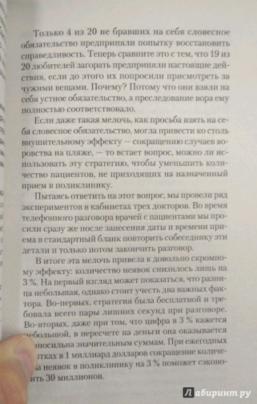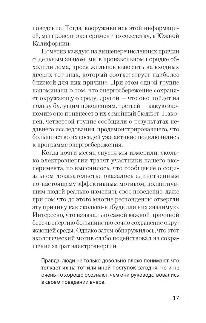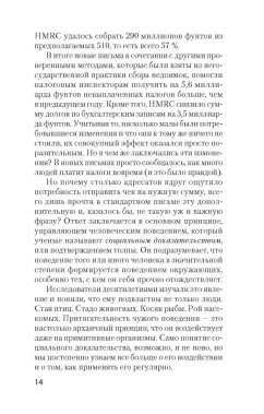 ОписаниеНовая книга Чалдини - мощный прорыв в сложном искусстве убеждения, более 50 удивительно простых способов влияния на людей. Не важно, кого вам надо убедить и в чем: начальника - поддержать идею, коллегу - помочь с проектом, клиента - сделать покупку, супруга - вынести мусор, ребенка - выполнить домашнее задание без капризов… Вопрос в другом. Что конкретно можно изменить в вашем подходе, чтобы убеждать намного эффективнее? Старые методы больше не работают. В эпоху кризиса доверия и избытка информации нужны новые технологии убеждения. Люди все чаще принимают решения, основываясь не на самой информации, а на контексте, в котором эта информация представлена. В современном мире именно маленькие изменения способны оказывать сильнейшее влияние. Изменения, которые вы сможете немедленно применить на практике. Изменения, благодаря которым ваша способность убеждать резко возрастет. Это и есть важные мелочи. Когда дело касается влияния и убеждения, именно они гарантируют успех!..СвернутьНовая книга Чалдини - мощный прорыв в сложном искусстве убеждения, более 50 удивительно простых способов влияния на людей. Не важно, кого вам надо убедить и в чем: начальника - поддержать идею, коллегу - помочь с проектом, клиента - сделать покупку, супруга - вынести мусор, ребенка - выполнить домашнее задание без капризов… Вопрос в другом. Что конкретно можно изменить в вашем подходе, чтобы убеждать намного эффективнее? Старые методы больше не работают. В эпоху кризиса доверия и избытка информации нужны новые технологии убеждения. Люди все чаще принимают решения, основываясь не на самой информации, а на контексте, в котором эта информация представлена. В современном мире именно маленькие изменения способны оказывать сильнейшее влияние. Изменения, которые вы сможете немедленно применить на практике. Изменения, благодаря которым ваша способность убеждать резко возрастет. Это и есть важные мелочи. Когда дело касается влияния и убеждения, именно они гарантируют успех!..СвернутьСвернуть