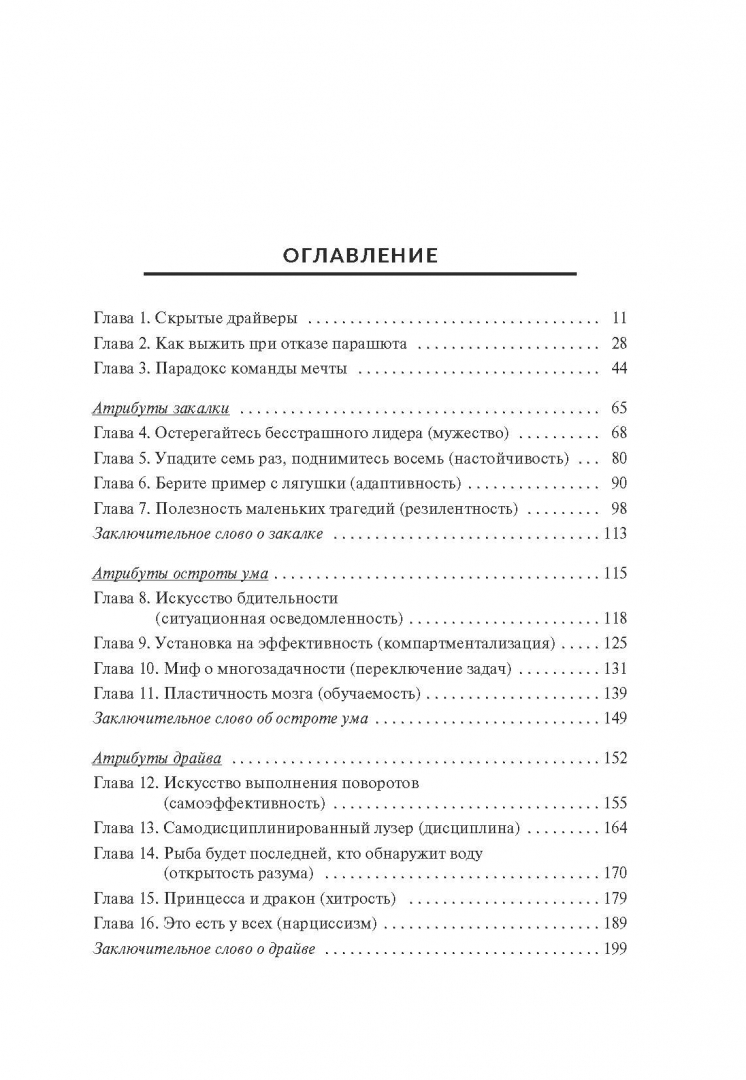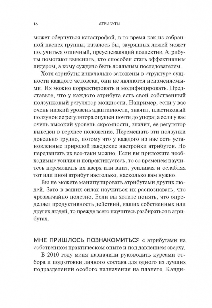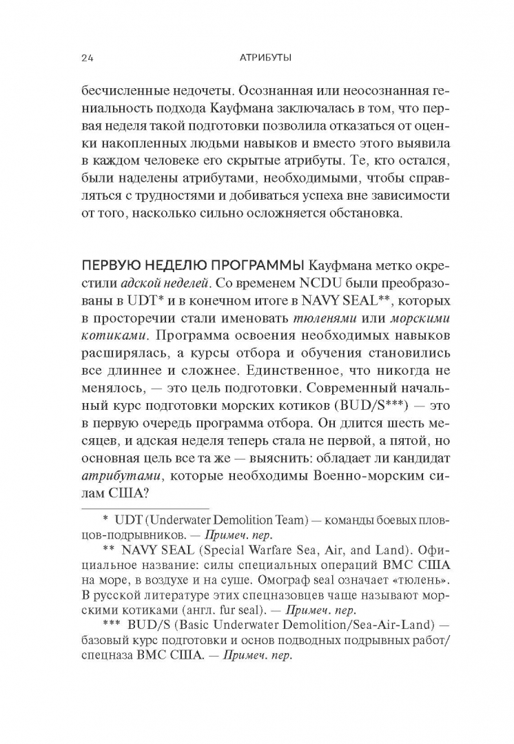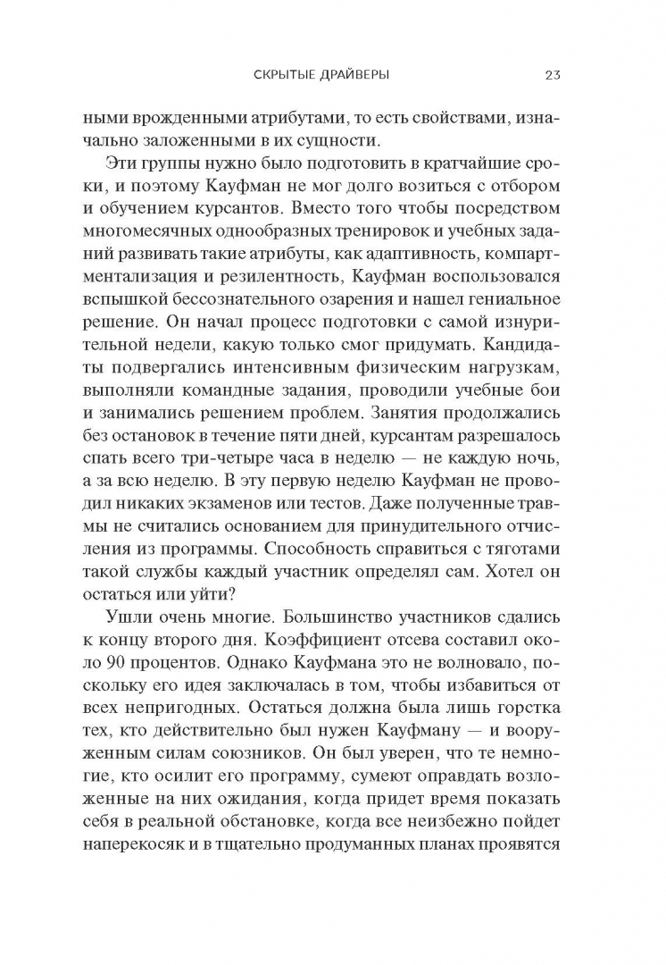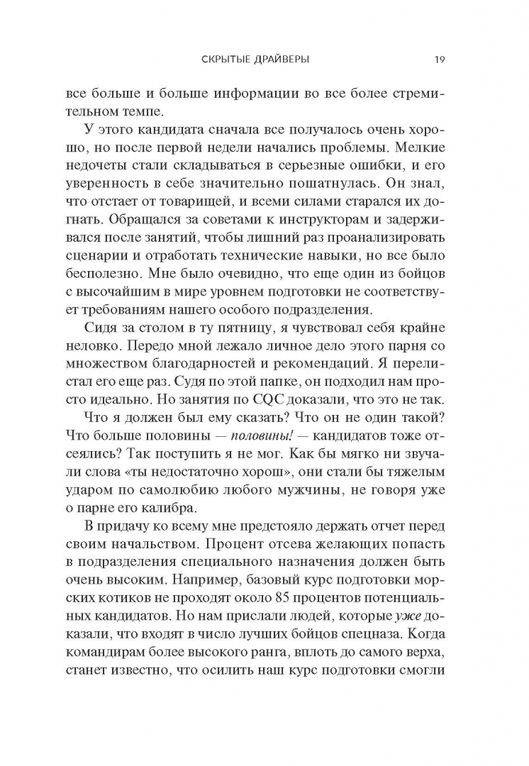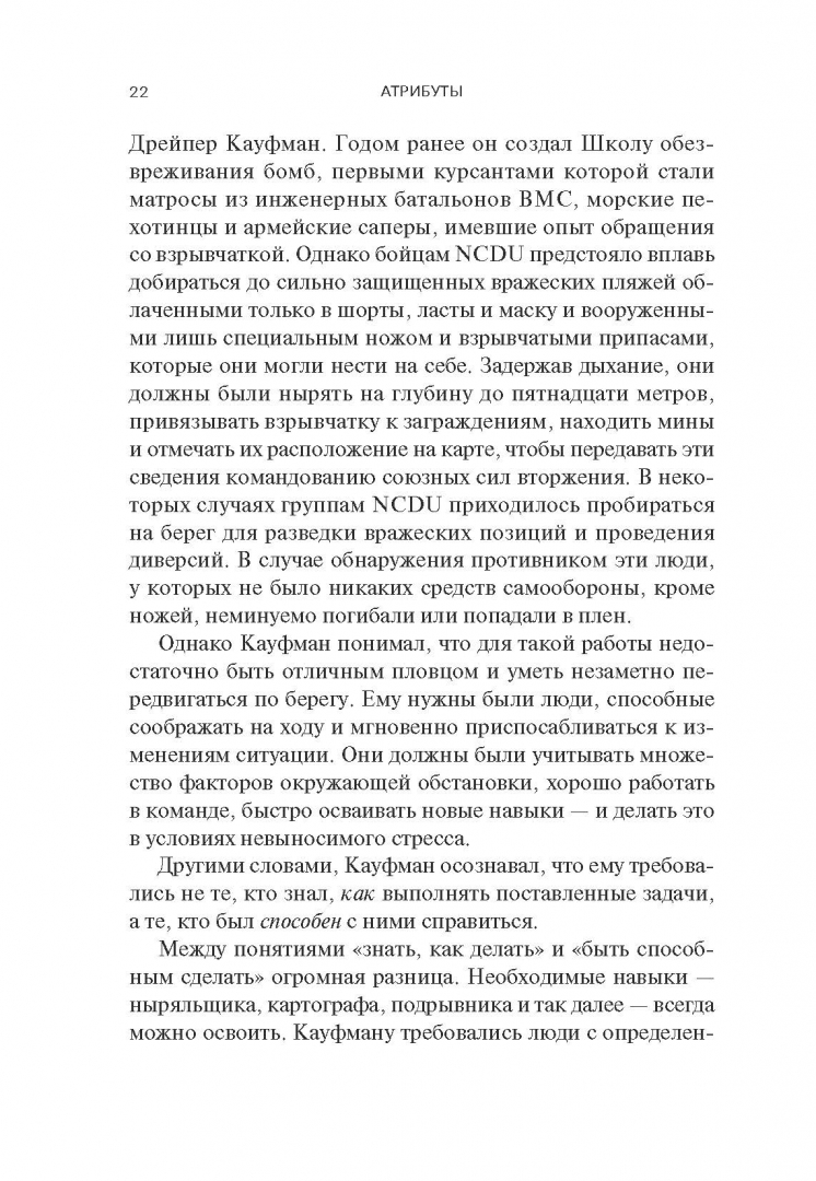 ОписаниеРаскройте секрет высокой продуктивностиРич Дивини, боевой офицер спецназа ВМС США, много лет руководил курсами подготовки личного состава для особого разведывательно-диверсионного подразделения. Программа обучения была настолько трудной, что из сотен кандидатов с блестящими послужными списками с ней справлялись лишь единицы элитных бойцов. Причем предсказать, кто сумеет успешно пройти испытание, чаще всего было невозможно. Многие фавориты терпели неудачу, в то время как некоторые аутсайдеры добивались самых лучших показателей. Почему же наличие превосходно развитых навыков не помогало кандидатам лучше всех решать боевые задачи высшего уровня сложности?Со временем тайну удалось разгадать. Оказалось, что продуктивность индивидуальных и командных действий бойцов спецназа зависит не столько от приобретенных навыков, сколько от врожденных личностных качеств. В этой книге вы найдете подробное описание ключевых атрибутов человека, таких как хитрость, адаптивность и даже нарциссизм. Знакомство с ними поможет вам научиться распознавать и развивать эти качества в себе и своем окружении, чтобы использовать их для достижения лучших результатов во всех сферах вашей жизни.Эта удивительная книга объясняет, почему некоторые люди умудряются процветать даже в самых тяжелых обстоятельствах... — Чарльз Дахигг, писательПотрясающая книга… если вы стремитесь стать лучше, вам обязательно нужно ее приобрести. — Дэниел Койл, автор бестселлеровОриентир для всех, кто стремится повысить уровень доверия и продуктивности в своей команде. — Саймон Синек, писатель и ораторСвернутьРаскройте секрет высокой продуктивностиРич Дивини, боевой офицер спецназа ВМС США, много лет руководил курсами подготовки личного состава для особого разведывательно-диверсионного подразделения. Программа обучения была настолько трудной, что из сотен кандидатов с блестящими послужными списками с ней справлялись лишь единицы элитных бойцов. Причем предсказать, кто сумеет успешно пройти испытание, чаще всего было невозможно. Многие фавориты терпели неудачу, в то время как некоторые аутсайдеры добивались самых лучших показателей. Почему же наличие превосходно развитых навыков не помогало кандидатам лучше всех решать боевые задачи высшего уровня сложности?Со временем тайну удалось разгадать. Оказалось, что продуктивность индивидуальных и командных действий бойцов спецназа зависит не столько от приобретенных навыков, сколько от врожденных личностных качеств. В этой книге вы найдете подробное описание ключевых атрибутов человека, таких как хитрость, адаптивность и даже нарциссизм. Знакомство с ними поможет вам научиться распознавать и развивать эти качества в себе и своем окружении, чтобы использовать их для достижения лучших результатов во всех сферах вашей жизни.Эта удивительная книга объясняет, почему некоторые люди умудряются процветать даже в самых тяжелых обстоятельствах... — Чарльз Дахигг, писательПотрясающая книга… если вы стремитесь стать лучше, вам обязательно нужно ее приобрести. — Дэниел Койл, автор бестселлеровОриентир для всех, кто стремится повысить уровень доверия и продуктивности в своей команде. — Саймон Синек, писатель и ораторСвернутьСвернуть