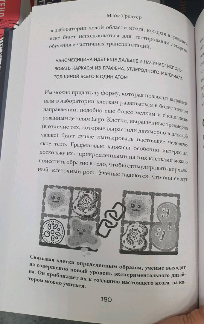 ОписаниеКак менялся мозг человека в ходе эволюции? Почему мы видим сны и что такое осознанные сновидения? Где хранятся воспоминания? Как депрессия и зависимость влияют на мозг? Почему стресс - один из злейших врагов мозга? Что происходит с мозгом во время медитации? В данной книге речь идет о различных феноменах мозга. Майк Трентер рассказывает о когнитивных искажениях, неспособности узнавать лица, случае Финеаса Гейджа, слепозрении и идеальной памяти. Автор дает читателям возможность заглянуть внутрь мозга и понять, что происходит, когда он работает не так, как надо. Книга под научной редакцией Михаила Тардова, д.м.н., невролога, профессора кафедры общей врачебной практики медицинского института РУДН. "Доктор Трентер объясняет все таким языком, который будет понятен даже людям, которые вообще ничего не знают о науке (мне, например). Кроме того, некоторые его комментарии так меня рассмешили, что мне захотелось отвлечь мужа от чтения его книги, чтобы поделиться с ним. Доктор Трентер включил в книгу не только ответы на вопросы, но и главы о "секретных материалах" нейробиологии, которые понравились мне еще больше, чем часть с вопросами и ответами. Главы относительно короткие, поэтому вы можете выбирать, что почитать. Нет необходимости читать книгу от корки до корки, и мне это понравилось". - Читатель с AmazonСвернутьКак менялся мозг человека в ходе эволюции? Почему мы видим сны и что такое осознанные сновидения? Где хранятся воспоминания? Как депрессия и зависимость влияют на мозг? Почему стресс - один из злейших врагов мозга? Что происходит с мозгом во время медитации? В данной книге речь идет о различных феноменах мозга. Майк Трентер рассказывает о когнитивных искажениях, неспособности узнавать лица, случае Финеаса Гейджа, слепозрении и идеальной памяти. Автор дает читателям возможность заглянуть внутрь мозга и понять, что происходит, когда он работает не так, как надо. Книга под научной редакцией Михаила Тардова, д.м.н., невролога, профессора кафедры общей врачебной практики медицинского института РУДН. "Доктор Трентер объясняет все таким языком, который будет понятен даже людям, которые вообще ничего не знают о науке (мне, например). Кроме того, некоторые его комментарии так меня рассмешили, что мне захотелось отвлечь мужа от чтения его книги, чтобы поделиться с ним. Доктор Трентер включил в книгу не только ответы на вопросы, но и главы о "секретных материалах" нейробиологии, которые понравились мне еще больше, чем часть с вопросами и ответами. Главы относительно короткие, поэтому вы можете выбирать, что почитать. Нет необходимости читать книгу от корки до корки, и мне это понравилось". - Читатель с AmazonСвернутьСвернуть
