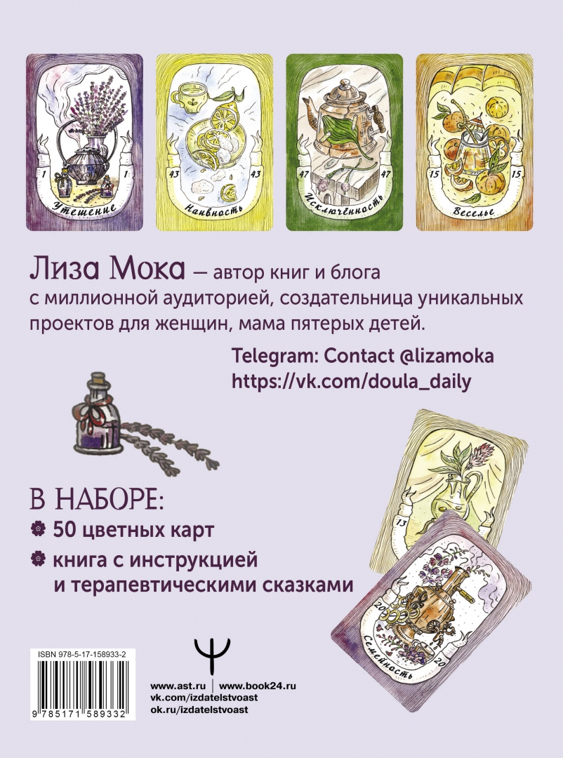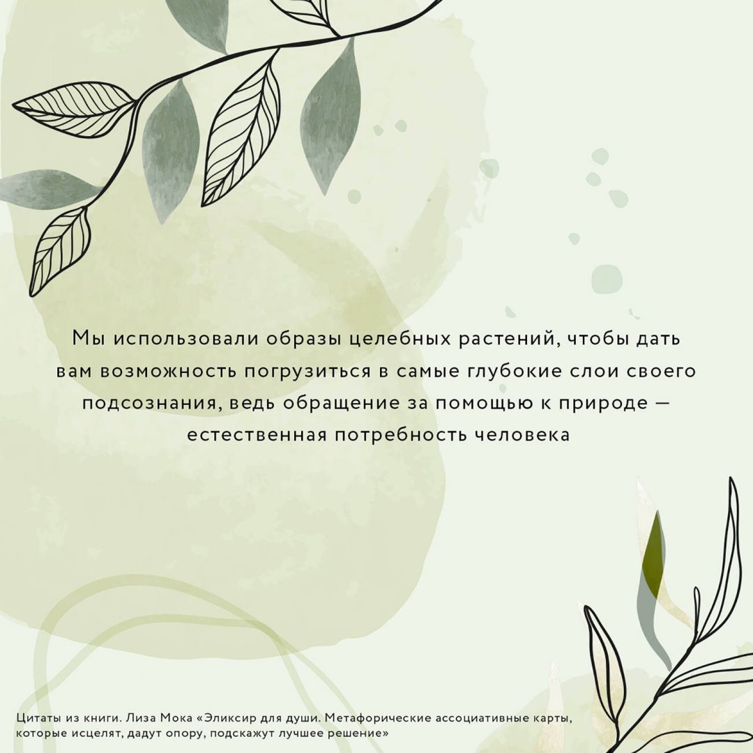 ОписаниеМетафорические Ассоциативные Карты (МАК) - это прекрасный инструмент для психологической работы, который может использоваться как психологом или психотерапевтом при работе с клиентом, так и каждым человеком самостоятельно. Эта уникальная колода создана популярным блогером и психологом Лизой Мокой и замечательной художницей в сотворчестве с самой природой. Лиза Мока - автор книг и блога с миллионной аудиторией, создательница уникальных проектов для женщин, мама пятерых детей.Образы целебных растений дадут вам возможность погрузиться в самые глубокие слои своего подсознания, замедлить свой привычный ритм, открыться целительной силе окружающего мира и получить доступ к его ресурсам. К колоде приложена книга терапевтических сказок, которые станут дополнительным инструментом психологической работы. Это настоящий эликсир для души!Для использования карт не нужно проходить специальное обучение, технология работы с ними проста и понятна.Работа с этой колодой поможет найти ответы на вопросы, которые не дают вам покоя, получить поддержку в любой ситуации, а также настрой на день и прояснить направление, в котором нужно двигаться для достижения намеченных целей.Красивые, стильно оформленные карты приятно держать в руках. Они также станут прекрасным подарком.В наборе: красивая подарочная коробка, 50 авторских карт с акварельными рисунками целебных растений, книга терапевтических сказок.СвернутьМетафорические Ассоциативные Карты (МАК) - это прекрасный инструмент для психологической работы, который может использоваться как психологом или психотерапевтом при работе с клиентом, так и каждым человеком самостоятельно. Эта уникальная колода создана популярным блогером и психологом Лизой Мокой и замечательной художницей в сотворчестве с самой природой. Лиза Мока - автор книг и блога с миллионной аудиторией, создательница уникальных проектов для женщин, мама пятерых детей.Образы целебных растений дадут вам возможность погрузиться в самые глубокие слои своего подсознания, замедлить свой привычный ритм, открыться целительной силе окружающего мира и получить доступ к его ресурсам. К колоде приложена книга терапевтических сказок, которые станут дополнительным инструментом психологической работы. Это настоящий эликсир для души!Для использования карт не нужно проходить специальное обучение, технология работы с ними проста и понятна.Работа с этой колодой поможет найти ответы на вопросы, которые не дают вам покоя, получить поддержку в любой ситуации, а также настрой на день и прояснить направление, в котором нужно двигаться для достижения намеченных целей.Красивые, стильно оформленные карты приятно держать в руках. Они также станут прекрасным подарком.В наборе: красивая подарочная коробка, 50 авторских карт с акварельными рисунками целебных растений, книга терапевтических сказок.СвернутьСвернуть