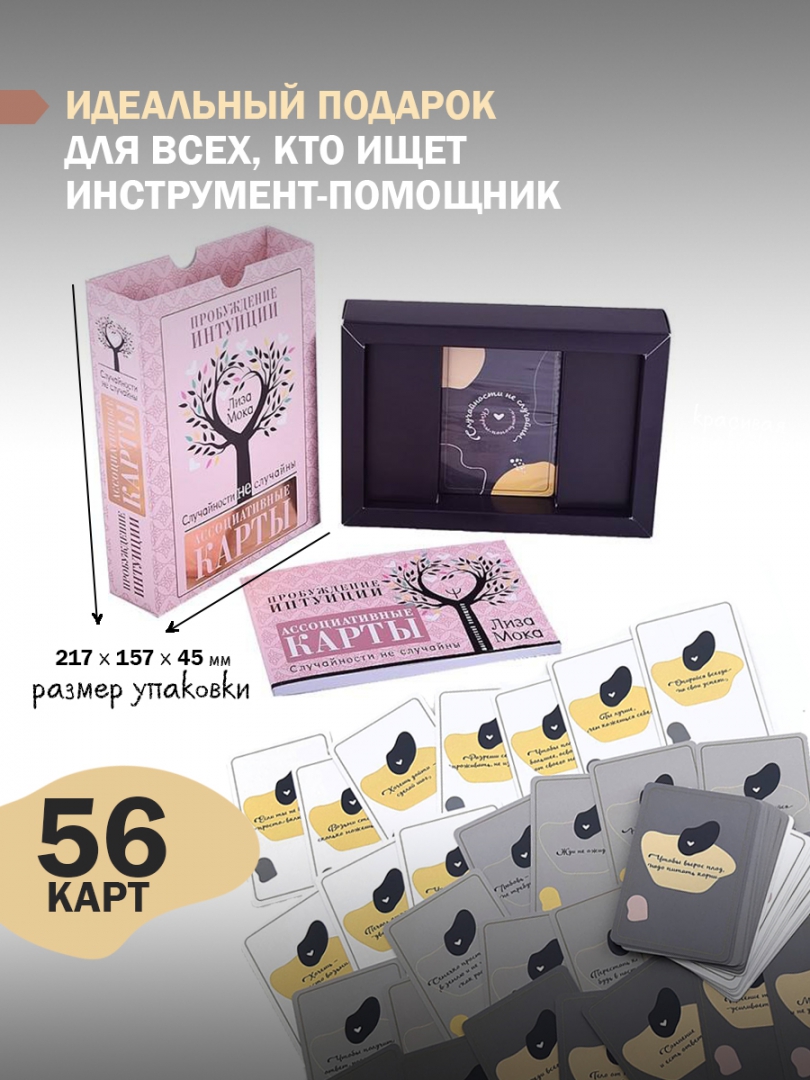 ОписаниеПеред вами - уникальная авторская колода интуитивных карт, которые станут вашими незаменимыми помощниками в самых разных жизненных ситуациях: когда вам требуется ответ на сложный вопрос, подсказка, рекомендация, совет, когда вы хотите получить настрой на день, заглянуть в будущее, чтобы увидеть последствия вашего выбора. Интуитивные карты-помощники основаны на авторской системе, которая дает возможность получить доступ к удивительному источнику информации, скрытому в каждом из нас, - к нашему подсознанию.Создательница карт - популярный блогер, психолог и консультант с миллионной аудиторией в Сети, автор уникальных проектов по саморазвитию.В комплекте 52 карты + книга 128 стр.Интуитивные карты «Случайности не случайны. Карты-помощники, пробуждающие интуицию» созданы известным блогером Лизой Мокой. Простые фразы, которые во найдете на этих картах, помогут вам обратиться к собственным интуиции и подсознанию, получить ответ на любой вопрос, поддержку в сложной ситуации и настрой на день. Интуитивные карты-помощники просты в использовании, а подробная инструкция, составленная Лизой Мокой, поможет вам в решении любых задач.